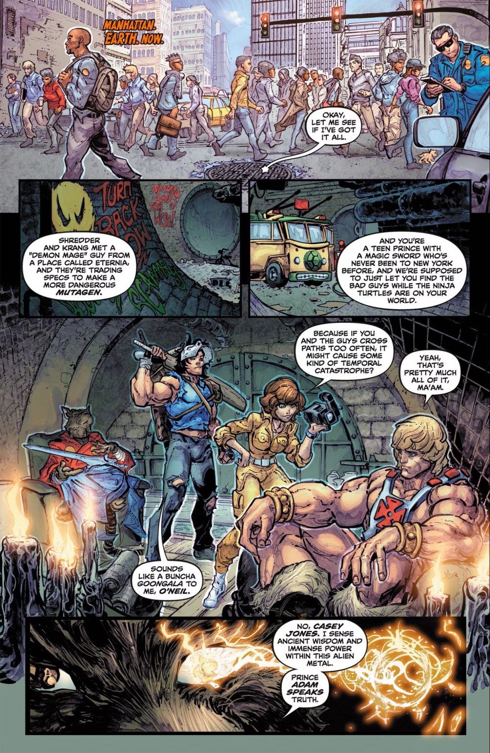 Résumé: The Teenage Mutant Ninja Turtles and He-Man travel to one another's universes in the hopes of untangling the Knot in the cosmos. But despite plans to avoid jumbling realties, they find themselves drawn to each other's friends and allies. Meanwhile, timestress Renet has found herself in the past — smack-dab in the middle of the Foot Clan's training dojo — where a mysterious student may have something to do with all this trouble...