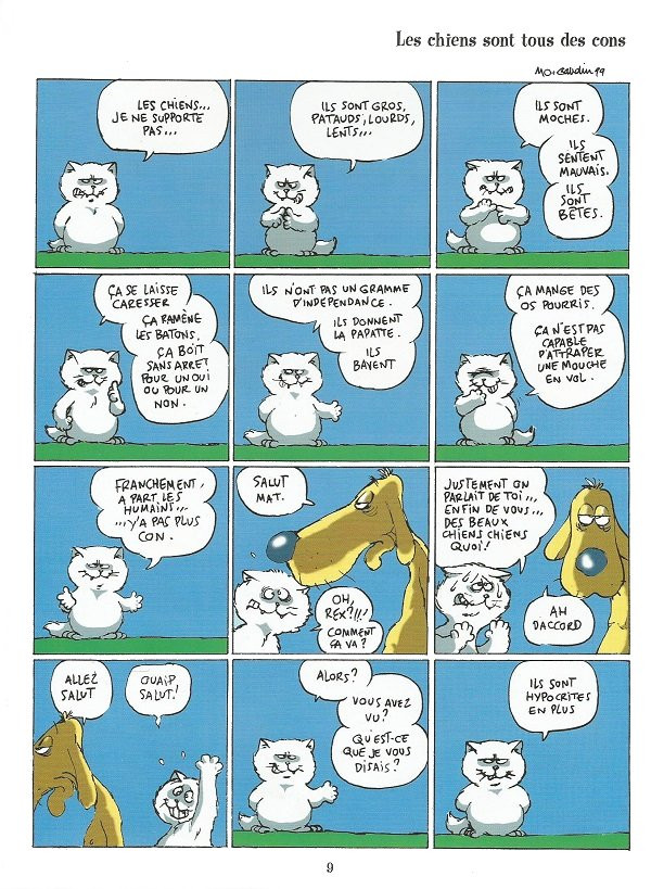 Voilà une série qui n'est pas très populaire. Pour la présenter un peu : Mat Matou est un énorme matou toujours prêt à accomplir les pires bêtises car il est malin, rusé, bête et attendrissant. Le genre est différent du célèbre Garfield. J'aime bien le dessin avec une imagerie un peu disneyenne. Pour le reste, c'est toujours dans la catégorie d'une page par gag. Et là, curieusement, je dois admettre qu'il y a de l'inventivité chez l'auteur qui fait des efforts. Cela se sent. Pour l'instant, peu de volumes sont sortis ce qui explique qu'il ne tombe pas dans le piège des gags à répétition. Pour autant, l'humour est souvent décalé et cynique mais d'autres fois hilarant. Cela confère un caractère un peu inégal à l'ensemble. Au final, nous avons droit à une série seulement sympathique qui plaira à tous les amateurs de chat. Et dire que je n'aime pas spécialement les chats !BDGest 2014 - Tous droits réservés