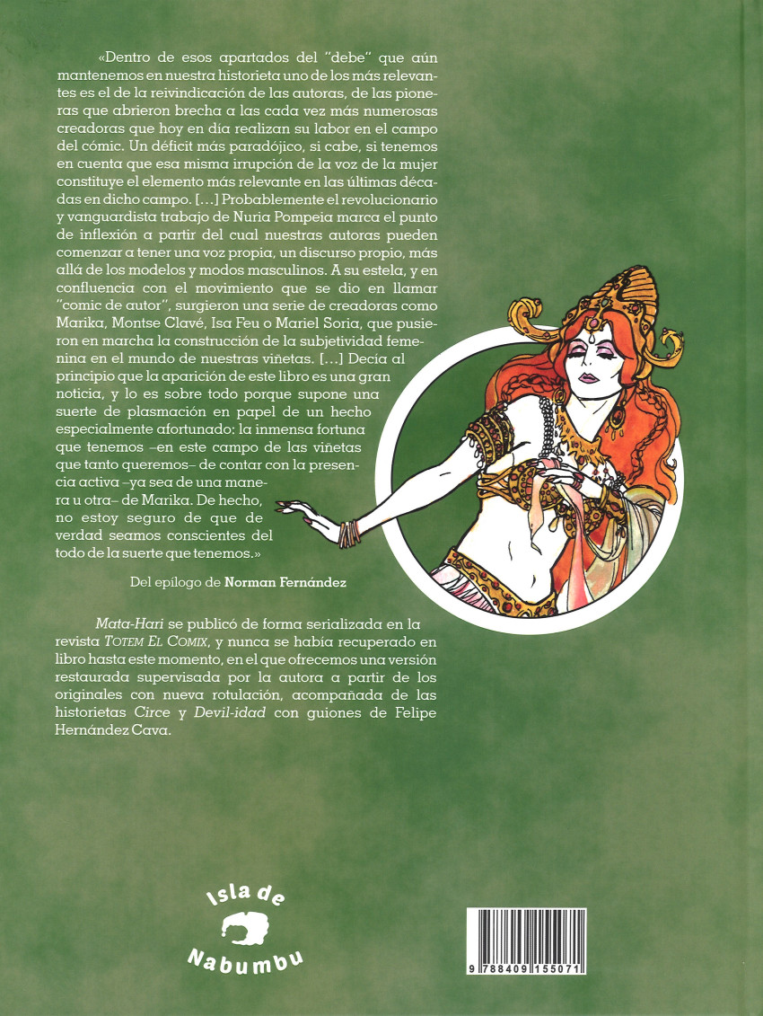 Info édition : MATA-HARI, de Marika et Andreu Martín reunit les épisodes de la bande dessinée publiés dans la revue "Totem el Comix". Il comprend également les bandes dessinées "Circe" et "Devil-idad", avec un scénario de Felipe Hernández Cava. L'édition est complétée par des textes de Marika, Andreu Martín, Hernández Cava et Norman Fernández.