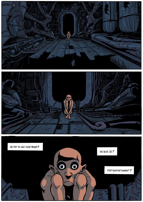 Stéphane Douay, quant à lui, s'est fait plaisir en créant ce personnage famélique, aux os saillants, dans lequel on pourrait presque reconnaître des réminiscences de son Don Quichotte dans la manche (chez Vents d'Ouest). Dans un décor laissant la part belle à l'imagination, seul ce corps presque torturé ressort, et évolue, vieillit surtout. Irène Häfliger, dans cet univers de machines et de solitude, varie sur une gamme de couleurs simple, les noirs. L'album est sombre, on y voit peu dans ce vaisseau abandonné par la lumière, éclairé par des champignons phosphorescents. Et c'est probablement pour cette raison que sa fresque, superbe carte grattée, ressort avec tant d'intensité au milieu de toute cette obscurité sur une double page à la beauté troublante.
