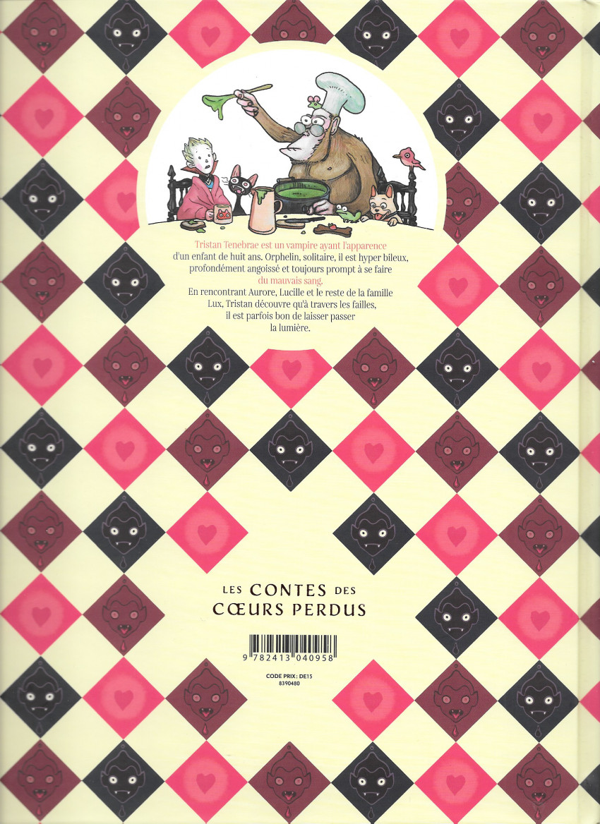 ristan Tenebrae a l’allure d’un petit garçon, mais il est plus que millénaire. Le vampire habite un manoir avec quelques spectres et Mister Jingles, un cuisinier orang-outan (psychologue à ses heures) qui ne sait que cuisiner le baba ganoush, une détestable purée d’aubergine pleine d’ail. Tout est rangé et ordonné dans cette vaste maison où les jours se suivent et se ressemblent. Le jeune solitaire croise Lucile et sa mère qui l’invitent dans leur quarante-cinq mètres carrés où elles vivent, dans un désordre total, avec cinq autres gamins. Le jeune homme, qui se fait du sang d’encre pour tout et rien, découvrira que le bonheur se trouve à l’extérieur de sa zone confort.