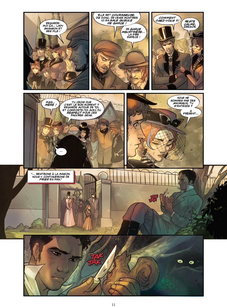 Une mystérieuse jeune femme, à la beauté froide, accompagnée de son majordome aussi classe que louche, une veuve digne mais détestée par beaucoup, une orpheline attachante et exploitée ainsi qu'un frère et une sœur que le destin n'a visiblement pas épargnée. Le casting est pléthorique, accrocheur et varié, à l'image des secrets que chacun semble dissimuler. Loin de livrer toutes ses clés, l'intrigue affiche clairement ses penchants fantastiques, voire horrifiques. L'autrice dépeint des ambiances glaçantes à souhait en y ajoutant, au besoin, un peu d'hémoglobine. S'appuyant sur un découpage dynamique qui emprunte beaucoup aux comics et faisant preuve d'un réel sens du rythme, son histoire s'avère immersive et prenante. À défaut d'être tout de suite convaincant tant les rebondissements ne surprendront pas les lecteurs assidus, l'ensemble est plaisant à suivre grâce à un graphisme agréable, une colorisation à propos et un savoir-faire indéniable en matière de narration.