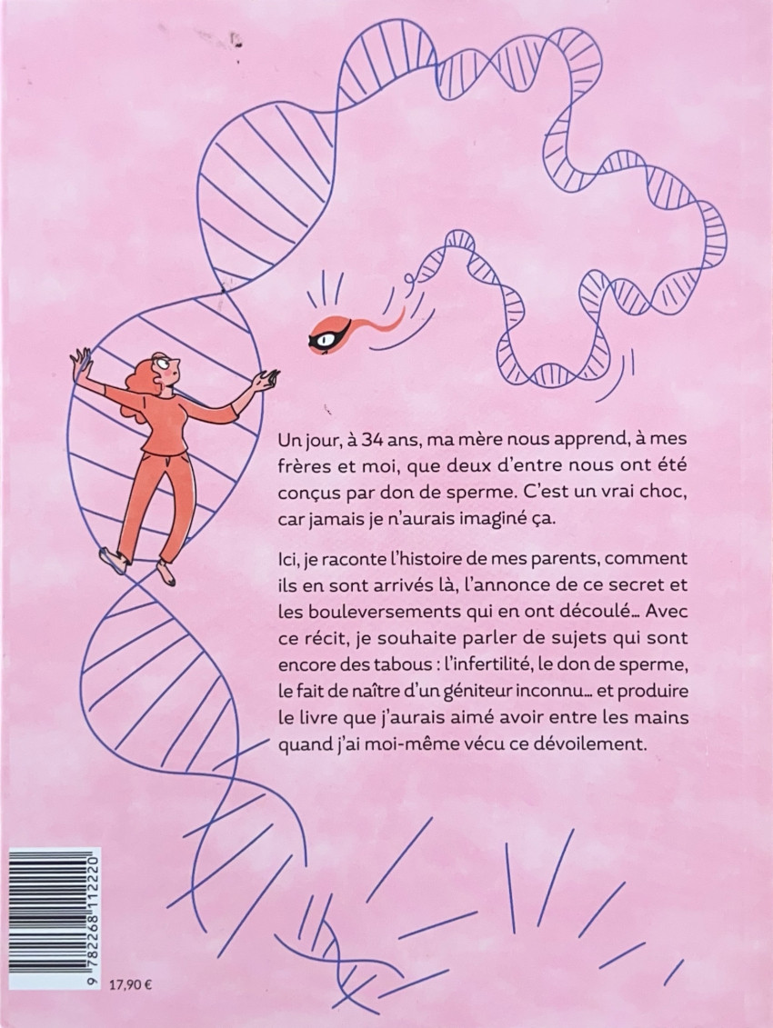 Ici, je raconte l'histoire de mes parents, comment ils en sont arrivés là, l'annonce de ce secret et les bouleversements qui en ont découlé… Avec ce récit, je souhaite parler de sujets qui sont encore des tabous : l'infertilité, le don de sperme, le fait de naître d'un géniteur inconnu… et produire le livre que j'aurais aimé avoir entre les mains quand j'ai moi-même vécu ce dévoilement.