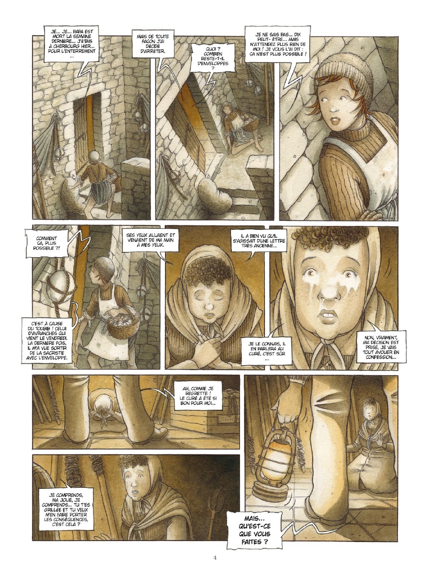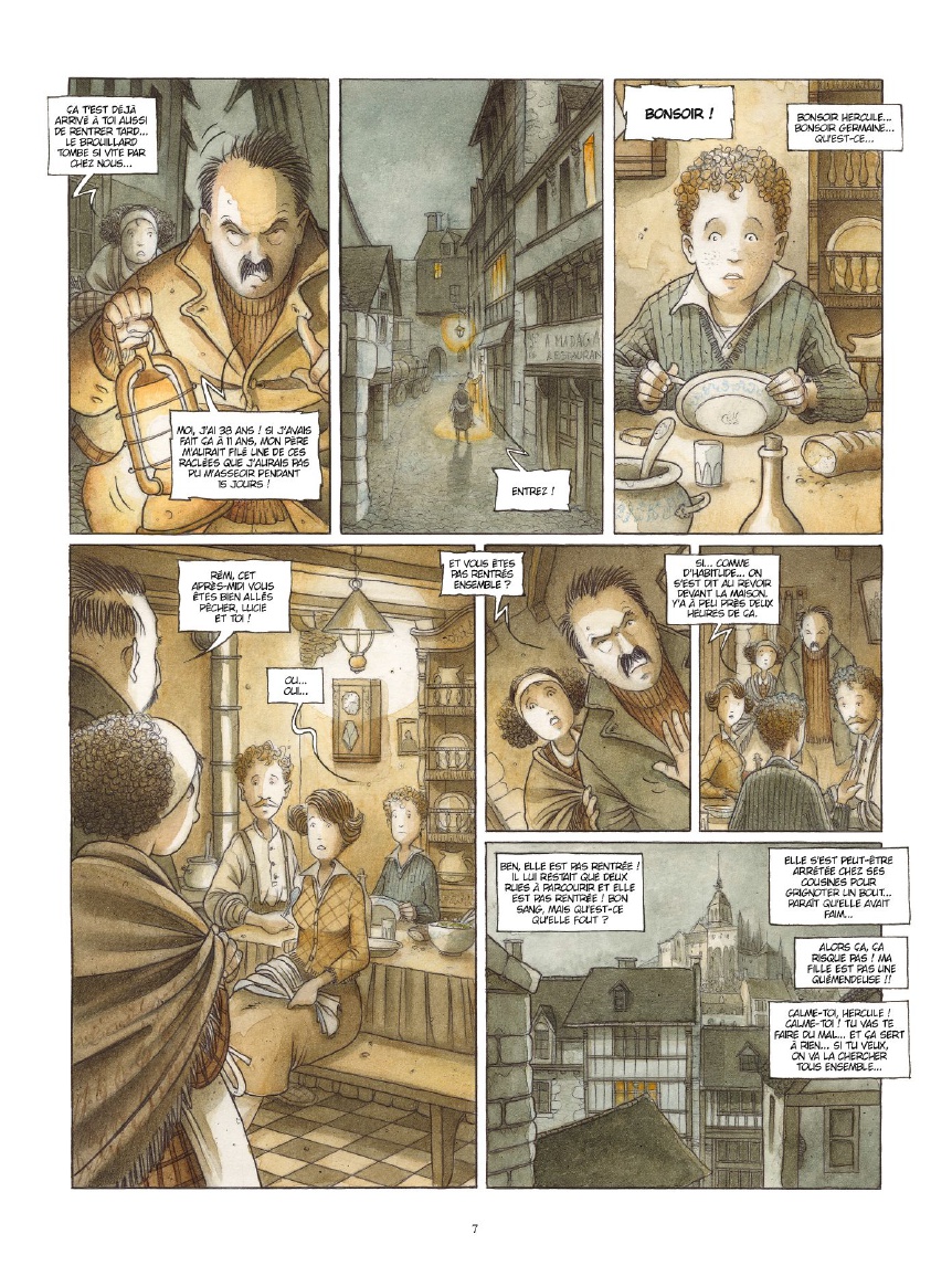 Mont-Saint-Michel. Octobre 1936. Lucie et Rémi ramassent des palourdes dans la baie lorsque retentit la cloche qui leur indique qu’il est temps de rentrer. Gravissant une ruelle en escaliers du Mont, Lucie surprend une conversation. Il y est question de lettres, d’argent, de curé… La demoiselle qui parle avec un inconnu ne veut plus trahir la confiance de l’ecclésiastique qui a été si bon avec elle. Elle veut tout confesser. L’individu ne compte pas la laisser faire et la tue. Secouée par ce qu’elle a vu et entendu, Lucie commet la maladresse de laisser tomber des palourdes. Aussitôt l’inconnu se lance à sa poursuite. Lucie ne rentrera pas ce soir… Critique : J’adore le travail à l’aquarelle de Marie Jaffredo. Il s’en dégage une foultitude de sentiments tellement c’est beau et poétique. Ses couleurs, fort dans les tons sépia, nous rappellent, mais en compagnie d’autres couleurs, ces photos anciennes, vieux souvenirs de famille. Cette intrigue policière est là pour rendre hommage au Mont-Saint-Michel à la demande des Editions du Patrimoine (Centre des Monuments nationaux) en collaboration avec Glénat. Ce lieu est une des grandes merveilles du monde. J’ai pu l’apprécier même si contrairement à ce qu’il se passe dans la BD, c’était au XXIe siècle avec des centaines (des milliers ?) de touristes en plein été par un soleil éclatant et non en automne en 1937 avec des brumes qui peuvent être à couper au couteau. Marie Jaffredo, architecte urbaniste de formation, excelle dans le rendu des bâtiments. Mais ses personnages, magnifiquement typés, ne sont pas en reste. On n’a aucun mal à s’immerger dans l’histoire même si le scénario n’est pas des plus originaux. Après tout, je pense que l’objectif est vraiment de faire découvrir la complexité de ce Mont que l’on vient visiter depuis le monde entier (enfin, quand il n’y a pas de pandémie). Le scénario est « tout public » et c’est parfait comme cela même si en tant qu’adulte j’aurais préféré davantage d’originalité. Je ne me lasse pas de contempler et de contempler encore les dessins et les couleurs de Marie Joffredo et cette ambiance de huis-clos. Je vous laisse… J’y retourne !BDGest 2014 - Tous droits réservés