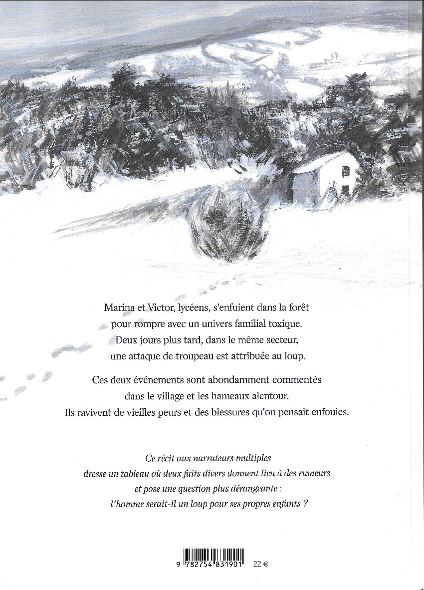 Rien de mieux pour deux adolescents, à savoir Victor et Marina, que de s'enfuir dans une forêt afin d'échapper à un univers familial toxique. Cependant, on peut également rencontrer des loups dans la nature et eux, ils ne font pas de quartier non plus. C'est en tous les cas, ce que croient les habitants de cette bourgade reculée dans la France profonde et rurale du Limousin. Il s'agit de réveiller nos peurs les plus profondes liées à des blessures d'enfance. Il s'agit surtout de faire face à des adultes médisants qui commentent les faits en les dénaturant totalement. La construction est basée sur les différents témoignages des habitants par rapport à cette fugue des 2 adolescents voulant s'arracher du joug familial. Il ne se passera pas grand chose car on s'attarde sur des bavardages et des considérations assez futiles comme pour nous montrer que les rumeurs vont bon train. Je m'attendais sans doute à autre chose avec ce titre qui fait plus documentaire de la BD chorale que du récit initiatique en phase avec la nature. On brosse un portrait pas très reluisant de cette France non urbaine. Il faut apprécier. On retiendra qu'une meute de loup peut cacher une meute humaine bien plus destructrice. Cependant, on le savait déjà.Le 11/03/2023 à 11:14:44