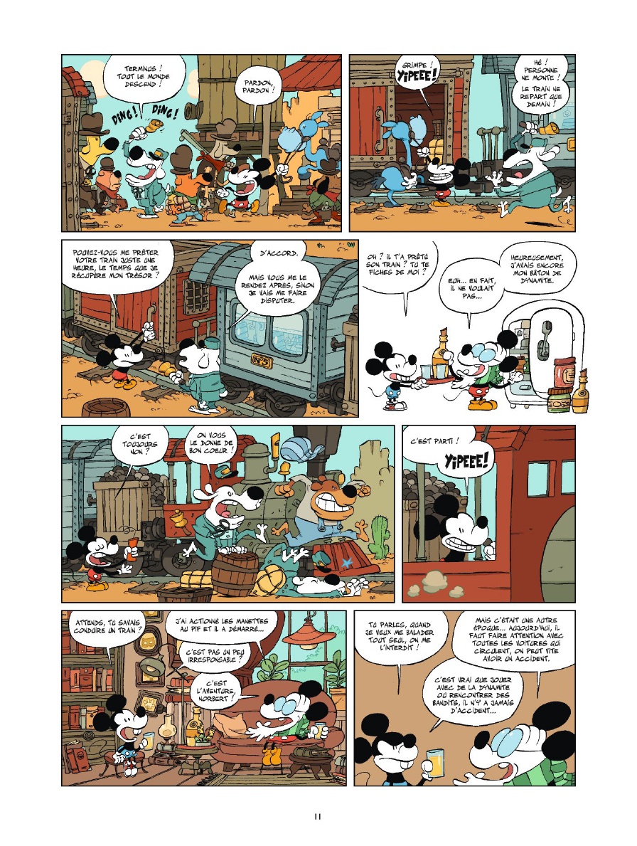 Gé-nial ! Franchement génial ! L'idée de représenter Mickey sous les traits d'un vieillard et de lui faire narrer ses aventures de jeunesse à son arrière-petit-neveu est vraiment bien trouvée. Une astuce scénaristique qui permet ainsi à Tebo de revisiter l'univers de Mickey, le mettant en scène dans des courtes aventures où on retrouve notre souris tour à tour cow-boy, prisonnier dans le Bayou, as de l'aviation pendant la Première Guerre Mondiale, trafiquant de chocolat durant la Prohibition ou encore astronaute ! C'est frais, c'est léger, c'est bourré d'humour, chaque histoire est vraiment bien imaginée et mise en scène, et "pépé Mickey" et son arrière-petit-neveu Norbert sont mignons tout plein. Quant au dessin, il est très séduisant, plein de pep's, et j'aime énormément le côté rondouillard des décors et des personnages. Sans parler de certaines trouvailles graphiques géniales, comme les pleines doubles pages qui sont visuellement très chouettes ! Bref, LA JEUNESSE DE MICKEY est, pour moi, une très très jolie surprise.BDGest 2014 - Tous droits réservés