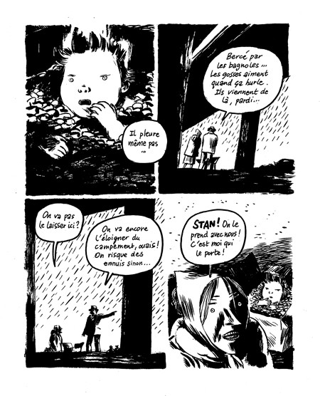 C'est une nouvelle version de Moïse assez moderne et plutôt trash. Ainsi, le petit Moïse est recueilli par des gens du voyage qui le retrouvent dans un cageot sous un échangeur d'autoroute. Cependant, ce Moïse là est plutôt un sale gamin qui ne va attirer que les ennuis et non pas le prophète attendu. Parents, abstenez vous d'une telle lecture car cela ne donnera pas envie d'adopter des enfants ! Notre "héros" n'inspirera pas la sympathie. L'auteur va pousser le vice plus loin. On devine que les actes de cet enfant seront plus que criminels, à savoir terroristes à l'ombre des tours jumelles qui se dessinent dans le décor. Moïse est en effet approché par une espèce de religieux islamiste, qui insidieusement parvient à le convaincre que sa révolte peut avoir une issue... J'ai bien aimé toute cette audace. C'est dessiné dans un noir et blanc sans concession. En effet, la lecture nous laissera sur un sentiment amer. Une bd qui dérange n'est pas pour me déplaire. Sombre comme le désespoir des exclus.BDGest 2014 - Tous droits réservés
