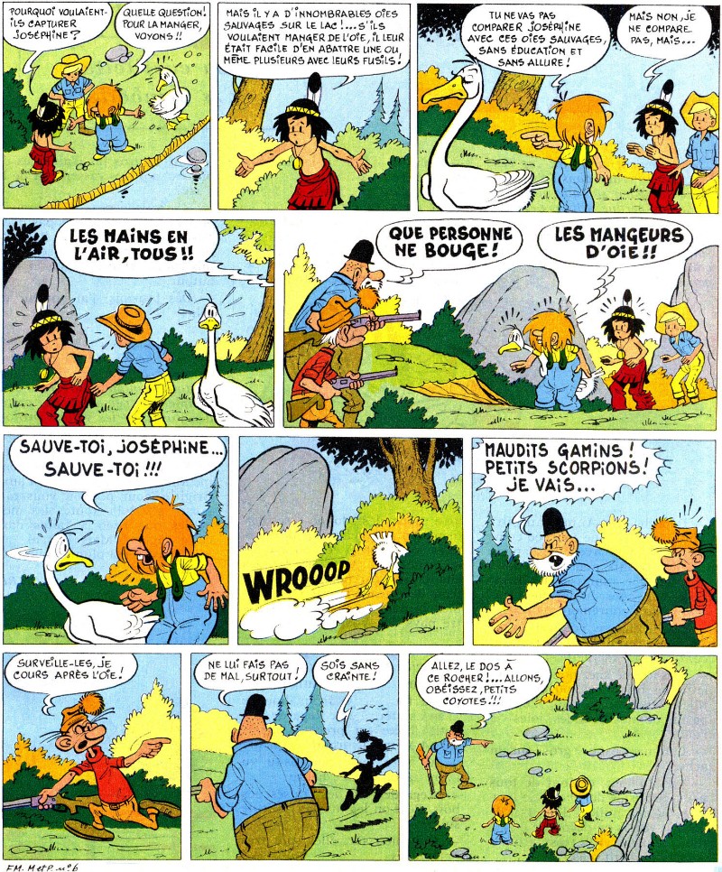 SCALP-DE-FEU, le jeune blanc aux cheveux roux, a perdu son oie domestique JOSEPHINE ! Pour la retrouver, nos amis devront affronter deux visages pâles qui ont d’autres projets pour l'animal...