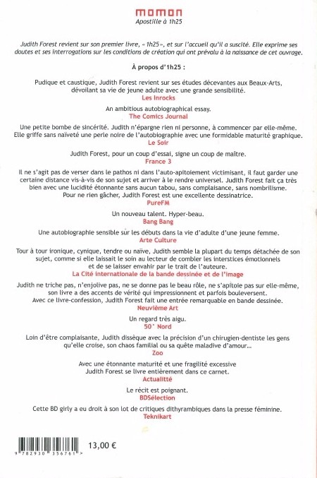 Judith Forest revient sur son premier livre, «1h25», et sur l'accueil qu'il a suscité. Elle exprime ses doutes et ses interrogations sur les conditions de création qui ont prévalu à la naissance de cet ouvrage