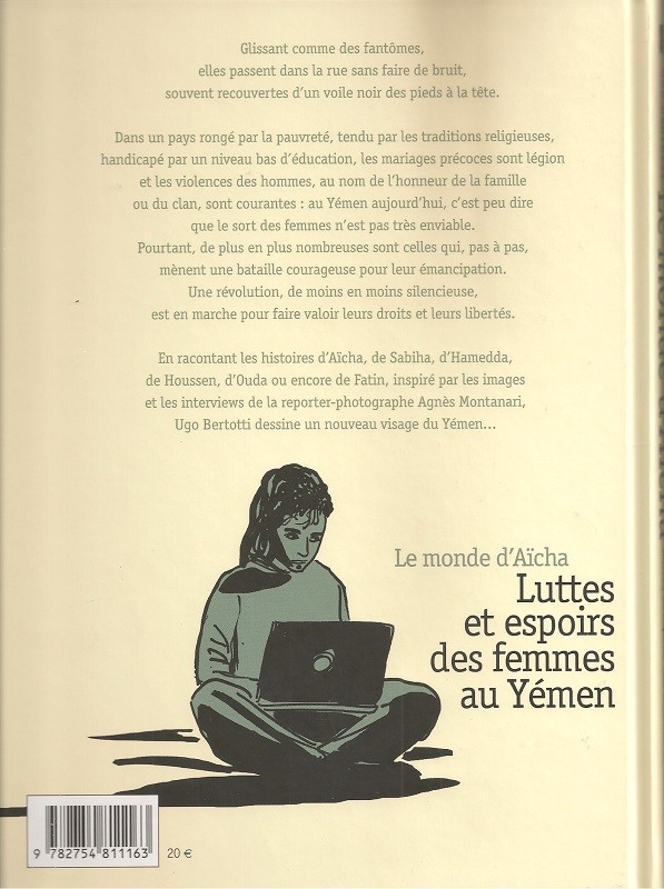 J'ai tellement de peine en refermant cet ouvrage qui nous donne un véritable aperçu des femmes au Yémen. C'est un pays rongé par la pauvreté où la tradition fait loi. Les femmes yéménites doivent être voilées de la tête aux pieds : point barre. La première histoire concerne Sahiba qui avait le malheur de regarder le paysage par sa fenêtre sans être voilée. Elle sera abattue comme un chien par son cousin de mari auquel on l'a livrée en pâture à l'âge de 11 ans. Pour la justification, c'est l'honneur de la famille qui a été bafoué car on a vu son visage ou, comble de malheur, ses chevilles. Voilà pour l'ambiance de cette BD reportage retraçant la condition des femmes. Bien sûr, on pourra me rétorquer que j'ai des yeux d'occidental qui ne respecte pas la culture de soumission de ces femmes. Il y a certes quelques avantages à être voilé comme les économies sur le maquillage ou les vêtements. Mais bon, je n'arrive pas à accepter cette tradition qui est basée sur la réputation. C'est au-delà de mes forces. Le monde d'Aïcha est peuplé de femmes qui ont des rêves et des désirs de liberté. Certaines de ces femmes ont fait avancer un petit peu les choses tout en respectant les règles. Elles ont quand même dû payer le prix. Le dessin en noir et blanc colle à merveille pour cet ouvrage qui fait dans la simplicité. Cela a été réalisé à partir des impressions de voyage de la photo-reporter Agnès Montanari, profondément marquée par son voyage au Yémen et sa rencontre avec les femmes de ce pays traditionaliste musulman pour ne pas dire archaïque. C'est bien d'avoir donné la parole à ces femmes. On verra leur photo à la fin de cet ouvrage. J'espère qu'un jour, elles pourront être libérées et vivre dans une société plus moderne et moins obscurantiste. C'est tout ce que je leur souhaite.BDGest 2014 - Tous droits réservés