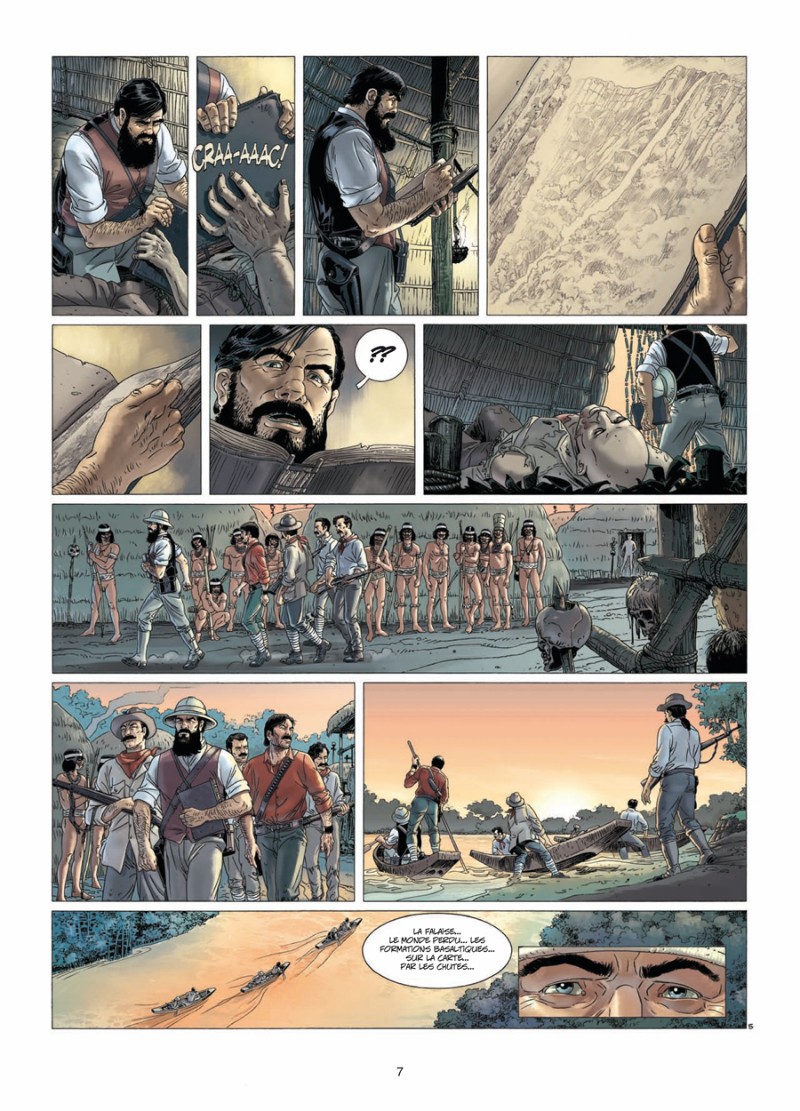 Christophe Bec présente ses personnages en quelques cases, résume des chapitres entiers du roman original de Conan Doyle en quelque dialogues - et à grands renforts de flashbacks sépia désuets - comme s'il partait du principe que le lecteur connaît forcément toute l'histoire...Difficile de s'attacher à nos explorateurs, et surtout au jeune journaliste Malone qui parait ici totalement anecdotique. Côté graphique, on a parfois la désagréable impression de lire une BD des années 70. Une laborieuse adaptation.