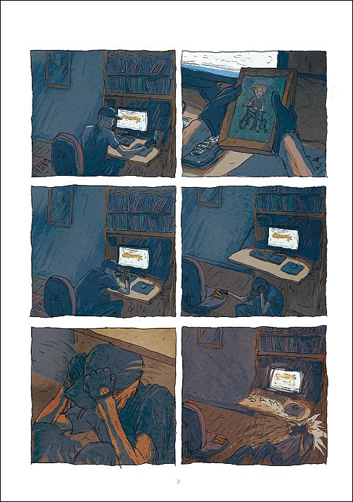 Au dessin, Tom s’approprie bien le sujet, avec un trait assez nerveux et un travail particulièrement réussi sur le personnage principal, même si, par instants, l’impression de voir apparaître un faciès qui n’est pas sans rappeler celui d’un certain Freddy Krueger (la faute au chapeau) n’est pas forcément une bonne idée dans le contexte. Il convient de noter de l’audace dans certains enchaînements, entre autres quand il use de petites cases - de celles que certains auteurs outre-Atlantique affectionnent -, le problème étant que le procédé n’est sans doute pas toujours utilisé à bon escient. Il en va de même de la volonté d’introduire une part d’esthétisme dans certaines planches : à trop forcer l’effet, cette démarche prend le pas sur le fond et ne sert pas la narration. L’usage des couleurs est plutôt assez bien vu, notamment dans les contrastes d’ambiance qu’il engendre entre les différentes séquences.