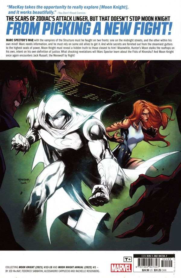 Info édition : Volume 3 - 1st printing. "Halfway to Sanity!" Collects Moon Knight (2021 Marvel) #13-18 and Moon Knight (2021 Marvel) Annual #1. Back Cover by Stephen Segoiva.