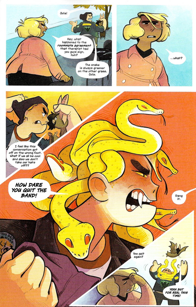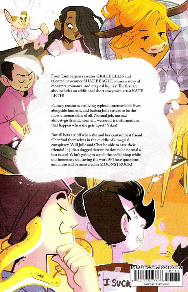 Résumé: A NEW ONGOING SERIES from Lumberjanes creator GRACE ELLIS and talented newcomer SHAE BEAGLE that tells a story of monsters, romance, and magical hijinks! The first arc also includes an additional short story with artist KATE LETH! Fantasy creatures are living typical, unremarkable lives alongside humans, and barista Julie strives to be the most unremarkable of all. Normal job, normal almost-girlfriend, normal...werewolf transformations that happen when she gets upset? Yikes! But all bets are off when she and her centaur best friend Chet find themselves in the middle of a magical conspiracy. Will Julie and Chet be able to save their friends? Is Julie's dogged determination to be normal a lost cause? Who's going to watch the coffee shop while our heroes are out saving the world??