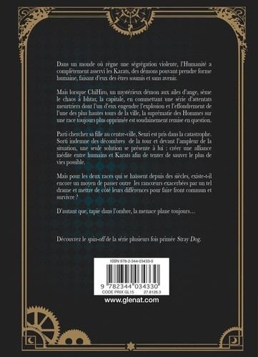 Résumé: Dans un monde où règne une ségrégation violente, l’Humanité a complètement asservi les Karats, des démons pouvant prendre forme humaine, faisant d’eux des êtres soumis et sans avenir.Mais lorsque ChiHiro, un mystérieux démon aux ailes d’ange, sème le chaos à Ishtar en commettant une série d’attentats meurtriers, la suprématie des Hommes sur une race toujours plus opprimée est remise en question.Parti chercher sa fille, Senri est pris dans la catastrophe. Sorti indemne des décombres, une seule solution se présente à lui : créer une alliance inédite entre humains et Karats afin de sauver le plus de vies possible.Mais pour les deux races qui se haïssent depuis des siècles, existe-t-il encore un moyen de passer outre les rancœurs exacerbées par un tel drame et mettre de côté leurs différences pour faire front commun et survivre ? D’autant que, tapie dans l’ombre, la menace plane toujours…