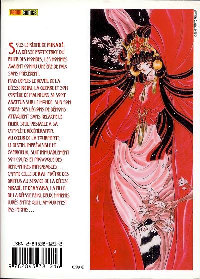 Depuis des millénaires, la déesse Mikage fait régner la paix. Une paix menacée par le réveil de sa rivale Reiki, avide de destruction. Mais les choses vont encore plus se compliquer lorsque Kai, le fils de Mikage, et Ayaka, la fille de Reiki, tombent amoureux ! Tamayo Akiyama est une ancienne du célèbre studio CLAMP d'où un dessin parfaitement reconnaissable, et plutôt maîtrisé. Malheureusement c'est bien le seul point positif... L'histoire, très confuse, ne passionne pas, et les personnages manquent singulièrement de charisme et de profondeur, un comble pour une ancienne de CLAMP ! Les séquences d'action, très brouillonnes, dénotent également un manque de maîtrise dans cet exercice. Un premier tome vraiment très poussif.BDGest 2014 - Tous droits réservés