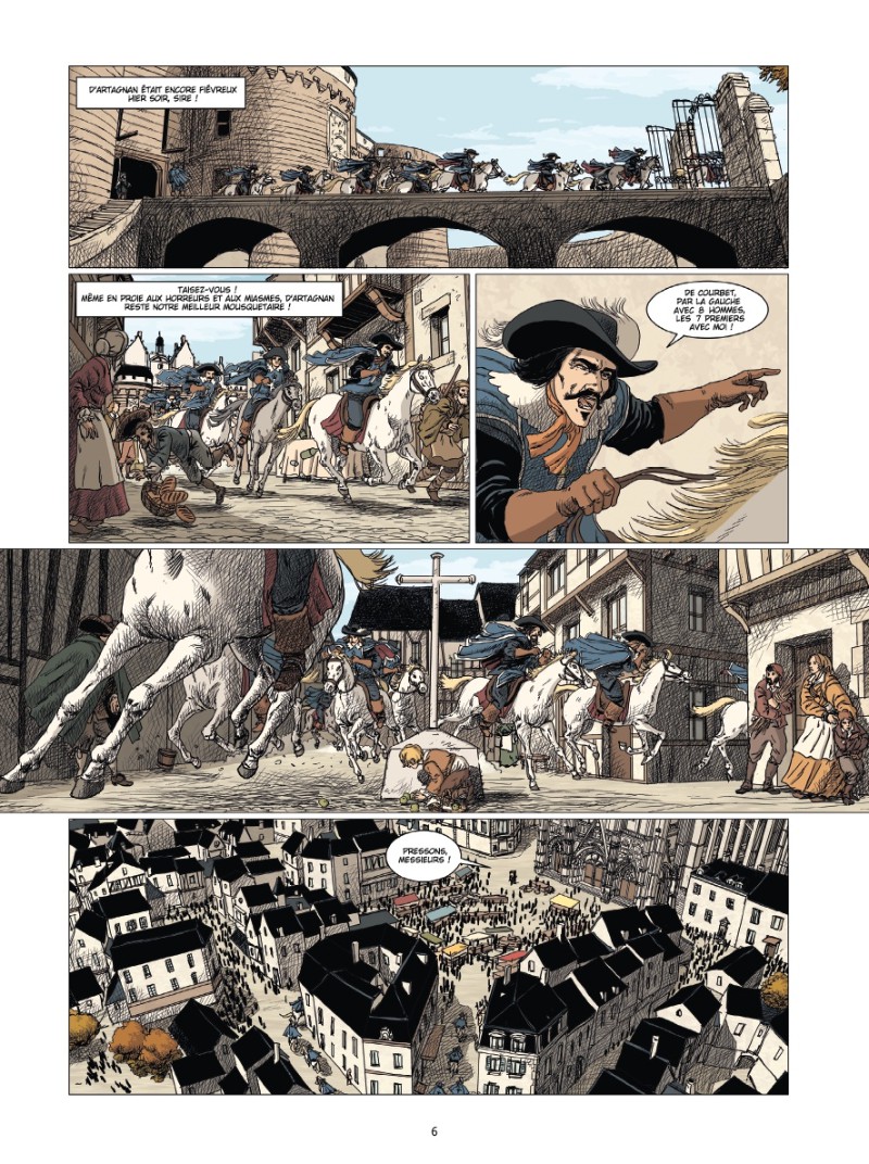 Classique jusque dans la trame hachurée de ses ombrages rappelant les gravures d’époque, le graphisme de Florent Calvez souffre cependant d’un manque d’expressivité des physionomies. Ceci dit, la fièvre romanesque de nombreuses chevauchées l’emporte sur ce petit travers et donne même à ces planches une personnalité qui manque tant à d’autres.