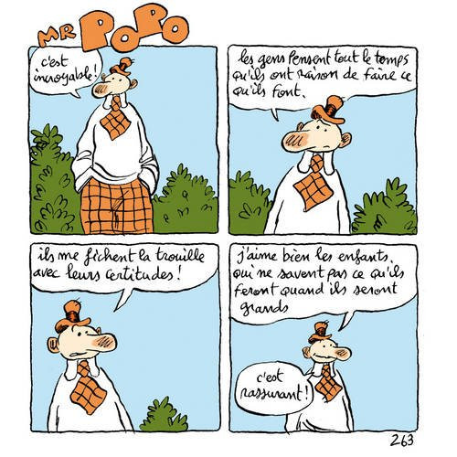 Résumé: Compilation de strips d'un personnage récurrent de l'auteur, en grande partie publiés sur un blog dédié. Monsieur Popo est un témoin plus philosophe que candide, qui s'interroge sur la réalité sociale selon les évènements de l'actualité. Procédé classique en soi qui permet à l'auteur un regard acerbe sur le monde qui l'entoure, la série de Monsieur Popo vaut pour la logique implacable, humaine et profondément drôle qui transite au travers des questionnements du personnage et incite à une vraie réflexion.