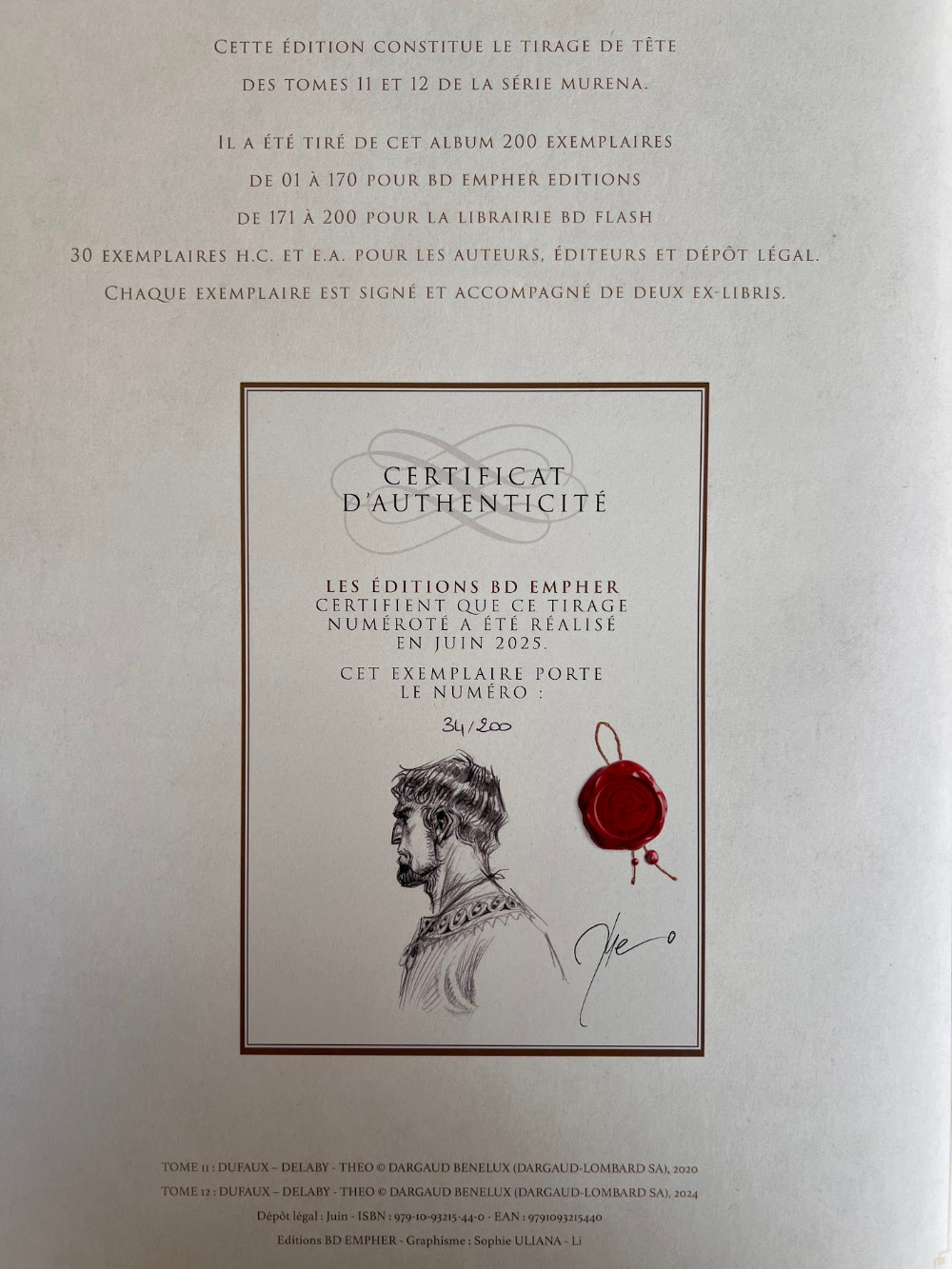 – Le cahier de croquis du tome 11 de Murena de 24 pages imprimé sur un papier offset Arena Ivory Smooth de 200 gr de chez Fedrigoni.