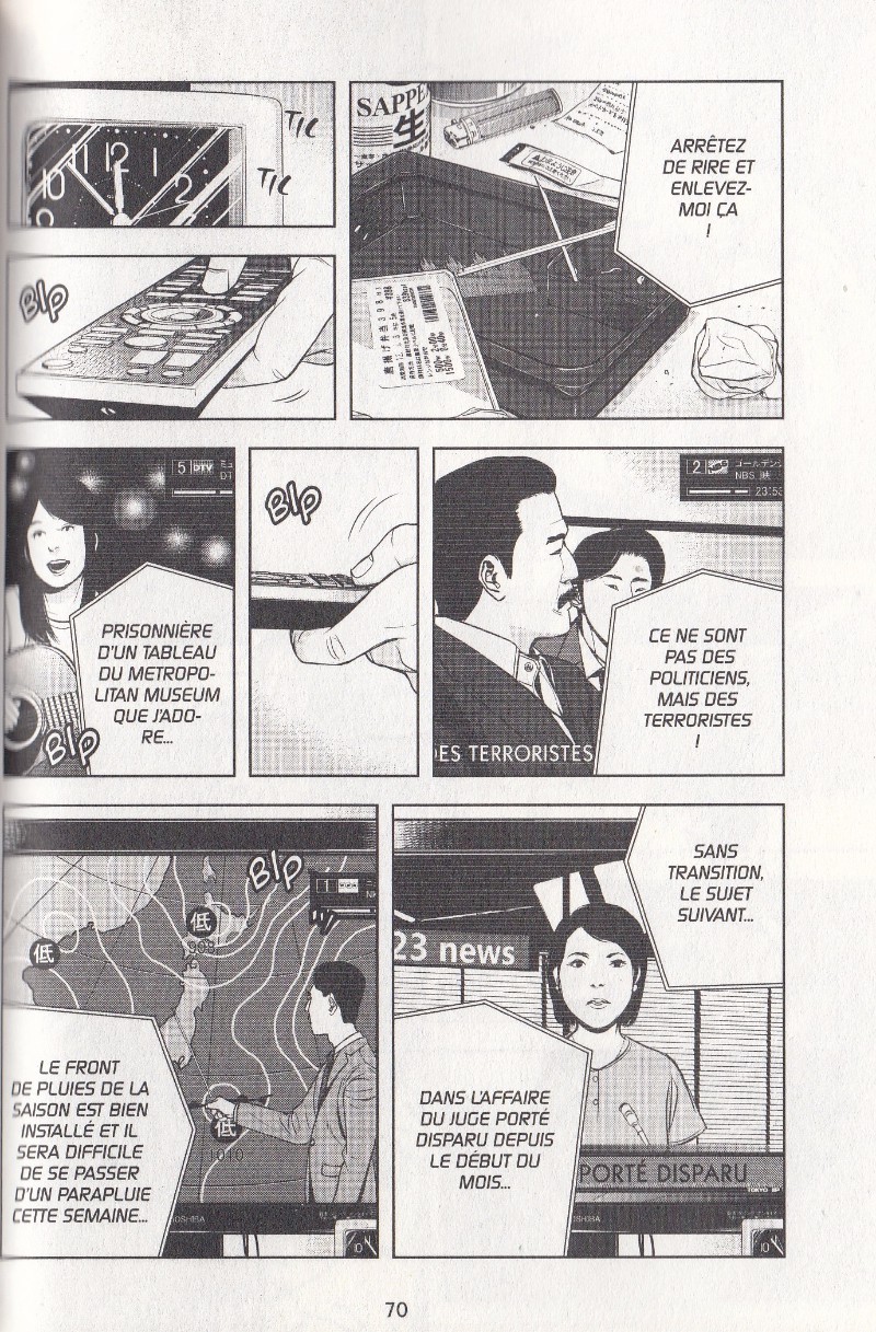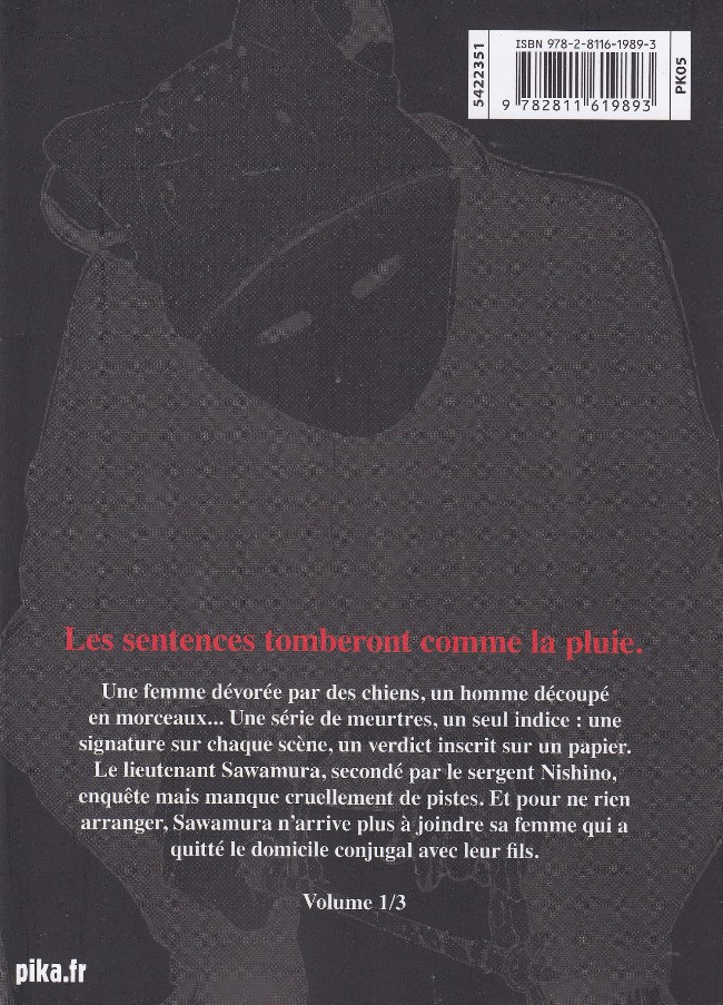 Sawamura enquête sur de mystérieux meurtres qui visent à rééquilibrer la justice. Les scènes de crime sont sanglantes et violentes. C'est gore à souhait. Le scénario est diabolique. Je suis rentrée dedans de suite et j'ai vu la fin de ce tome 1 arriver avec tristesse. Ce premier tome donne effectivement le ton et donne vraiment envie de découvrir la suite. L'histoire est le point fort de ce manga. Il y a néanmoins certains bémols. Les personnages sont sous- exploités, ce qui est vraiment dommage. Nous découvrons à peine Sawamura mais cela semble normal car il y a plusieurs tomes. D'autres personnages, passent sans réellement marquer l'histoire et j'avoue que cela m'a déçu. Autre bémol, tout arrive trop vite. Ce que j'apprécie dans les thrillers, c'est le fait que tout prend le temps de s'installer de façon subtile. Certes, ici ce n'est pas le format roman et les impératifs sont différents mais j'aurai nettement préféré que l'auteur prenne le temps de faire les choses et que le suspens s'installe. L'esthétique est typique du manga. Néanmoins, dans cet opus, la noirceur domine. C'est sombre et glauque à souhait. http://aufildesplumesblog.wordpress.comBDGest 2014 - Tous droits réservés