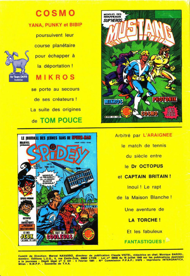 Peut être le plus whats(euh)fuck des 22 publications de Mustang. Jugez plutôt: Dans Mikros les auteurs se mettent en scène. Mieux ils sont pétés de pognon, star du comics et possèdent voitures hors de prix et maisons secondaires de multimilliardaires. La mise en abime fantasmagorique est total et c'est franchement fendard. Même que le gros méchant (qu'ils ont inventé dans la série) est partout autour d'eux. Même que une explosion atomique fait qu'ils sont que tous les deux vivants dans le monde....Et même que le State building (qui est un vaisseau spatial, je le rappelle) est de retour de la lune avec nos sup 'héros. ….bref, ça part en cacahouète grave et c'est ça que c'est bon. Après il y a Photonik qui raconte Tom Pouce. Retour en arrière salutaire. Sympa avec un final qui le fait. Et puis, il y a la nouvelle série qui remplace le nanardesque "Mustang". Et c'est un space convenu et convenable qui fait plein feu sur l'action et qui est dessiné par un bon ( un très bon même ) du nom de Jean Yves Mitton...Celui même qui est un des deux survivants d'une explosion atomique. Et là, je vous ai perdu....c'est sur...BDGest 2014 - Tous droits réservés
