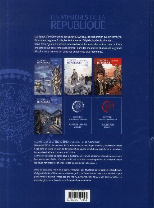 Résumé: Un polar historique dévoilant les sombres années de la République française. Novembre 1936. Le ministre de l'Intérieur en exercice, Roger Allendrot, est retrouvé mort noyé dans un étang en forêt de Rambouillet. L'enquête conclut à un suicide. Un an plus tard, le commissaire Peretti revient sur l'affaire. La thèse du suicide ne paraît plus si évidente. En effet, le policier se rend vite compte que l'autopsie avait été bâclée. Cela aurait-il à voir avec les prises de position du ministre contre les ligues nationalistes et antisémites qui pullulaient à l'époque? Dans ce deuxième tome de la série évènement Les Mystères de la 3ème République, Philippe Richelle, allié au dessin réaliste et précis de Pierre Wachs, tisse une nouvelle intrigue passionnante dans la France des années 30, partagée entre la tentation communiste et la tentation fasciste, à la veille de la Deuxième Guerre mondiale...