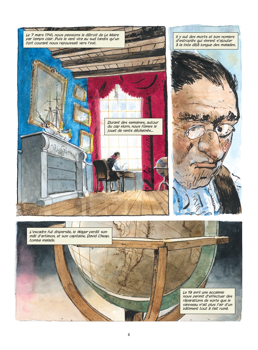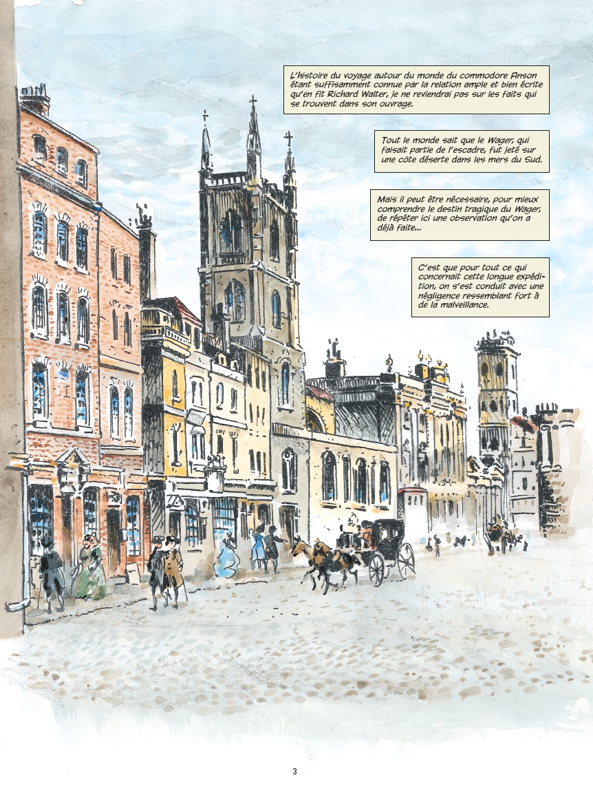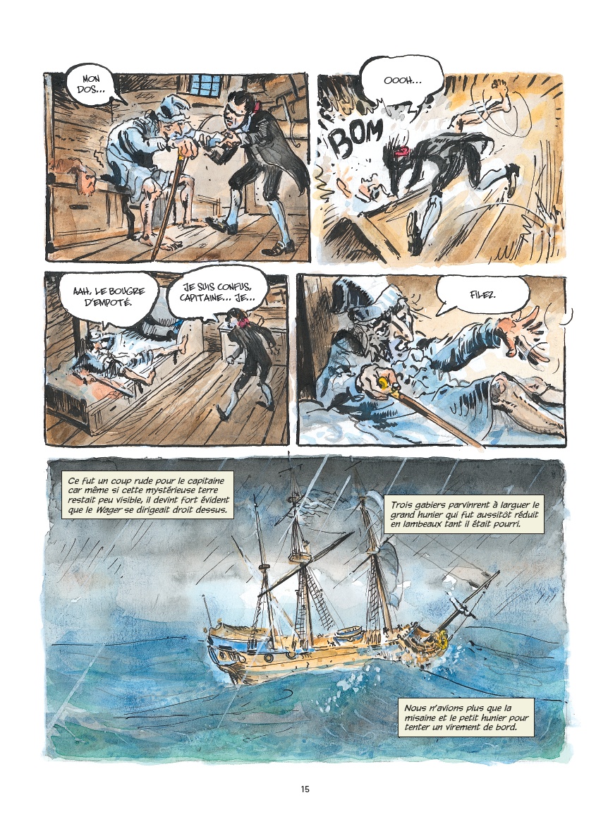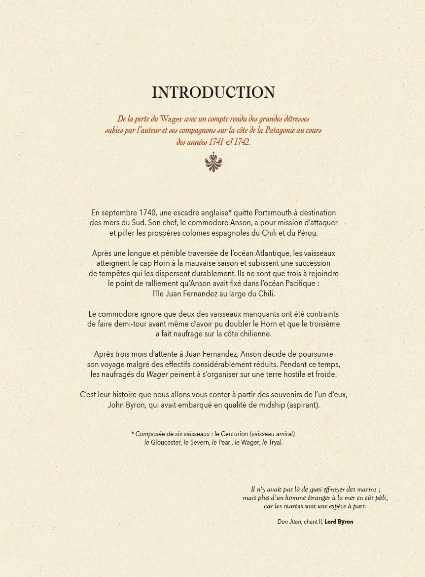 Après avoir raconté l’histoire de l’escadre du Commodore Anson, les auteurs se penchent sur le destin tragique d’un des navires, le Wager, d’après les souvenirs de John Byron, aspirant à bord du bateau et l’un des rares survivants. Un grand récit historique au souffle épique.