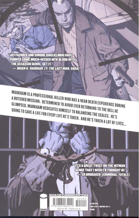 La prémice est prometteuse: un tueur à gage meurt, puis revient à la vie. Pour sauver son âme, il décide de sauver une vie pour chacune qu'il a prise (l'auteur est probablement un fan de Constantine? Qui sait) Le personnage est froid et sociopathe. Il est guidé purement par des motifs égoïstes: il ne veut pas aller en enfer. Il ne s'en cache pas non plus. Ça reste intéressant de voir comment il va réussir à sauver différentes personnes sans jamais tuer. C'est en fait un groupement d'histoires relativement indépendantes et l'auteur a précisé que c'était la formule qu'il préférait. Donc pas d'arc narratif global fort. Ça fait en sorte que l'ouvrage tombe plus dans la court du divertissement pur et dur qu'autre chose et des fois, après une journée au boulot, c'est exactement ce dont on a besoin! Je n'ai pas lu le deuxième tome encore, mais si je le vois passer et qu'il est pas trop cher, je vais me l'acheter.BDGest 2014 - Tous droits réservés