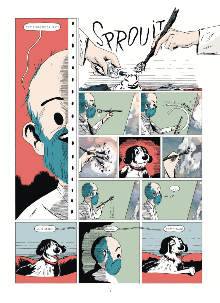 Je préfère les chats, mais bon... Le chien en question vient bouleverser la vie d’un artiste un peu raté, « Morose », qui trouve l’inspiration grâce à cette présence bienveillante. Inquiet de cette ascension nouvelle, son voisin, « Dubonheur », artiste ultra connu et devenu richissime grâce aux portraits de son propre animal de compagnie, un félin, en devient particulièrement envieux et aigri... La BD part sur un bon rythme, avec de belles idées scénaristiques, des pirouettes bien senties... La mise en scène est remarquable, avec quelques surprises selon les pages... L’auteur sait guider notre regard. Néanmoins, j'ai eu du mal avec l'aspect graphique, paradoxalement moderne et kitsch à la fois. Certes, c'est un ressort comique du livre, avec un effet pastiche. Mais le travail à l’ordinateur a tendance à me rebuter. Ne vous attendez pas à quelque chose de beau, selon les critères habituels en tout cas... L'esthétique du chien en particulier, mis en valeur sur la couverture, est très vilaine... Cela me fait penser à ces mémères et ces pépères, vous savez, celles et ceux qui aiment leur canidé, avec un amour immodéré, plus qu'ielles n’en ont pour les êtres humains. Les personnages ont aussi une allure marquante, avec de gros yeux noirs, qui évoquent plus le manga que le franco-belge. Ce ton, autant dérisoire que mièvre, se retrouve dans les jeux de mots (« dog-matisme », « malgré toutou », « Jack Kerouaf »...) ou autres phrases de leitmotiv... Si ce livre est accessible, il a aussi plusieurs niveaux de lecture. Il s'interroge, avec un certain humour, sur l'art et son jugement, les rivalités malsaines dans l'art, la mode ou encore les préférences, chien ou chat... Il pose ainsi de multiples questions : Comment faire un chef d’œuvre ? Est-ce qu’il faut de la maîtrise, un temps de labeur, un atelier digne de ce nom, de l’inspiration, un certain état de forme ? Est-ce qu’il s’agit simplement d’une affaire de goût, de rencontres ? Quelle est la place du public dans la réception de cet art ? Est-ce qu’il faut produire beaucoup, avoir une réflexion intellectuelle sur son travail ? Quelle est la place de l’argent, des récompenses et des médias, mainstream ou non ? Est-ce que l'art doit véhiculer un message, des émotions, respecter des canons académiques ou au contraire les faire évoluer ? Et puis après tout, est-ce qu’on s’en fout pas un peu, tant qu’on aime faire de l’art, que quelqu’un l’apprécie... Néanmoins, n’espérez pas trouver de réponses sérieuses à ces questions, pourtant intéressantes et non orientées sur le 9ème art. De plus, la relation des maîtres à leurs animaux m’a profondément ennuyé. D’autres BD m’ont apporté des expériences bien plus épiques, mystiques, enrichissantes intellectuellement ou parfois à se pisser dessus tellement elles étaient drôles ou effrayantes. Il est vrai que ce n’est pas tous les jours.. Ici, j’avoue que je suis resté un peu sur ma faim. J’admire cependant cet auteur, qui a su faire ce que moi je n’ai jamais fait. Mais ce n’est pas ce dont je rêve en tant que lecteur. Le Nécromanchien n’en demeure pas moins une œuvre singulière, cérébrale... ...et pleine de second degré.BDGest 2014 - Tous droits réservés