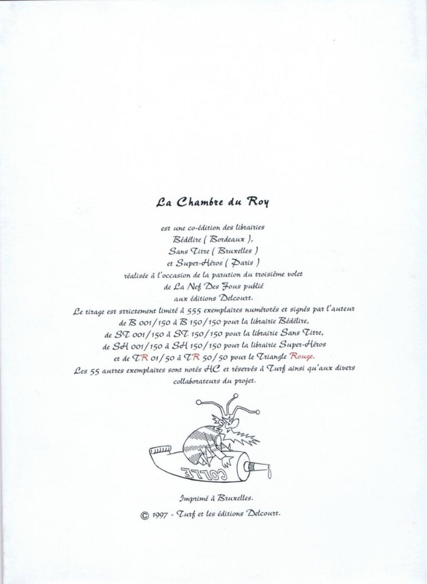 Numéroté et signé. 3 planches couleurs + 4 planches "Notice de montage". Le tirage total est de 555 exemplaires (150 Bédélire - 150 Sans Titre - 150 Super Héros - 50 Triangle rouge + 55 HC)