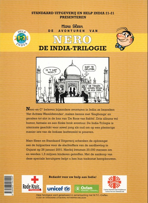 Info édition : Réédition en noir et blanc à l'occasion de l'action d'aide "Help Inda 21-21" pour les victimes du tremblement de terre du 26 janvier 2001 dans le Gujarat. Impressions au verso des logos Rode Kruis, Unicef, Oxfam et Caritas. En collaboration avec M.T.C. Creflex.