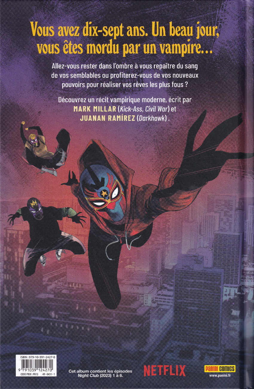 Résumé: Lorsqu'un adolescent de 17 ans devient un vampire que décide-t-il de faire ? Utiliser ses nouveaux pouvoirs pour devenir un super-héros et proposer son don à ses meilleurs amis ! Mais ce n'est pas si simple quand on pactise avec les créatures de la nuit... Mark Millar (Civil War, Old Man Logan) trouve ici un nouveau concept survitaminé qui renouvele à la fois le genre super-héroïque et le mythe du vampire. Voici le premier volume d'une série prévue en trois tomes et qui sera bientôt adaptée sur Netflix.