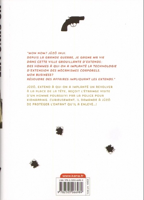 Jûzô Inui est un extend : on lui a implanté un revolver à la place de la tête. Depuis la grande guerre, il gagne sa vie dans cette ville grouillante d’autres extends, d’autres individus bénéficiant, comme lui, d’extensions mécaniques. Son business ? Résoudre des affaires dans lesquelles des extends sont impliqués. Un jour, Jûzô reçoit l’étrange visite d’un homme poursuivi par la police pour kidnapping. Il demande à Jûzô de protéger l’enfant qu’il a enlevé… !! Toutefois la gigantesque multinationale Beruhren (multinationale qui fabrique justement les extends) va entrer dans le jeu… Jûzo est loin de se douter du guêpier dans lequel il vient de fourrer son nez (ou plutôt le canon de son arme vu que sa tête est un flingue) ! Au départ, l’histoire d’un mec à la tête de flingue, on se dit qu’effectivement ça ne peut exister que dans un manga et ça fout un peu les boules. C’est effectivement un manga shonen (vous savez, ceux qui s’adressent aux garçons car les garçons, ça aime la bagarre !) dans lequel on retrouve les ingrédients voulus : un héros bagarreur et viril (avec une tête de flingue, je ne sais pas si je l’avais déjà dit), un enfant ingénu à la quête pure et idéaliste, une méchante sexy, une mafia qui n’est pas là pour rigoler, des industriels sans scrupules et des monstres à moitié humains… Au final, l’horreur scénaristique à laquelle on pouvait s’attendre n’est pas complète. Si, certes, quelques clichés ont la vie dure, Karasuma arrive à nuancer quelque peu son propos en confrontant les points de vue (celui qui veut sauver le monde versus celui qui veut sauver sa peau) et en initiant un début de réflexion sur l’intégration et la discrimination. Au niveau du dessin, le trait n’est pas aussi clair que dans d’autres mangas. Cela donne un aspect agréable car moins industrio-japonais au dessin (si je puis me permettre cette expression triviale) mais cela ne facilite pas la lecture. Les scènes de combat (qui ne sont pas légions mais récurrentes toutefois) manquent de lisibilité et il peut arriver que ce que l’on pense avoir compris de l’issue du combat soit tout le contraire. Cela pourrait être un choix de l’auteur à certains moments mais cela ne peut être le cas pour l’ensemble de l’album. S’il vous faut choisir quel manga offrir à votre neveu ado pour Noël, NO GUNS LIFE n’est donc pas le plus mauvais choix que vous pourriez faire ! Dave - HITRADIO NAMURBDGest 2014 - Tous droits réservés