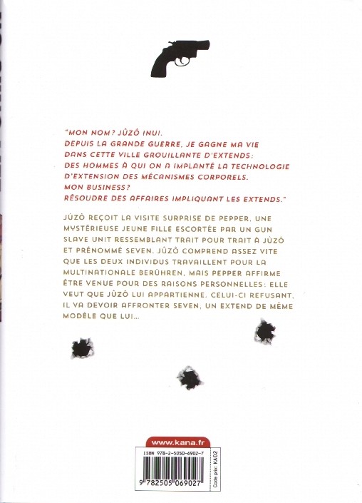 Résumé: Jûzô Inui est un extend : on lui a implanté un revolver à la place de la tête. Depuis la grande guerre, il gagne sa vie dans cette ville grouillante d'autres extends, d'autres individus bénéficiant, comme lui, d'extensions mécaniques. Son business ? Résoudre des affaires dans lesquelles des extends sont impliqués.