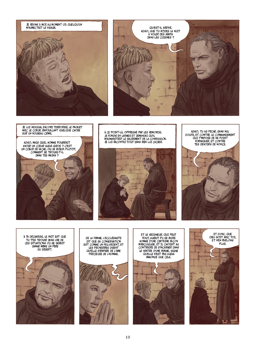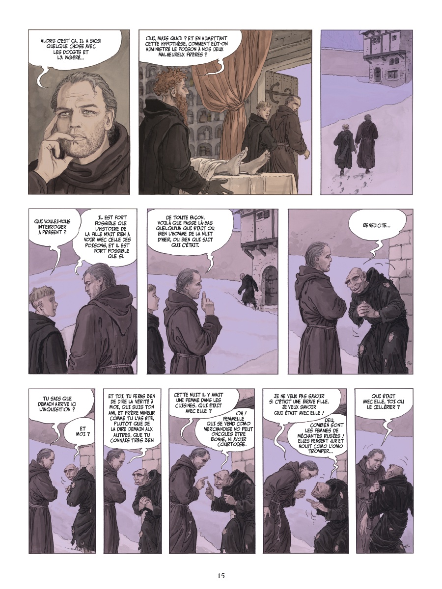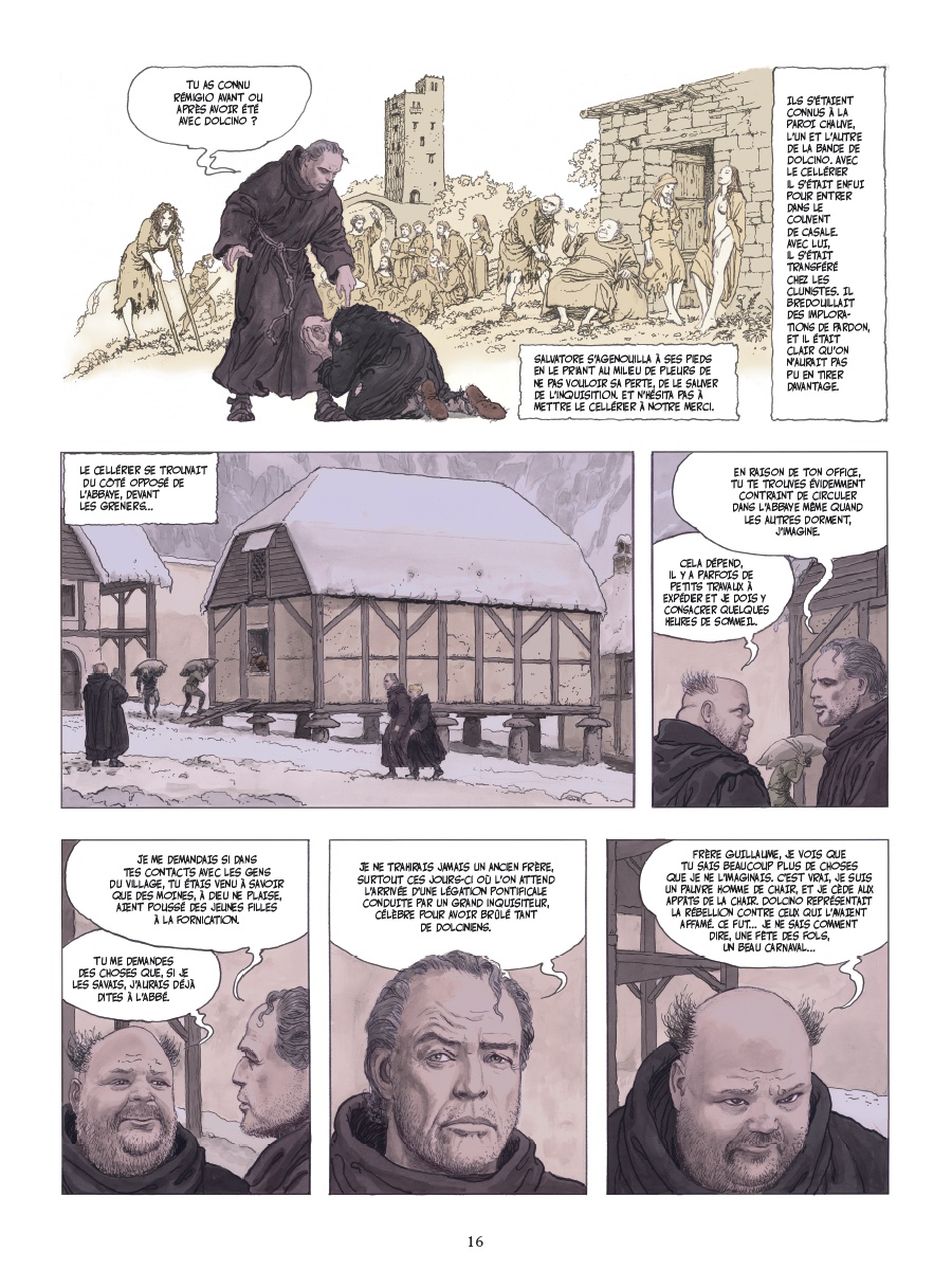 Le Nom de la rose est une œuvre riche, complexe, prégnante et difficile à appréhender, et son adaptation à la bande dessinée relève de la gageure ! Comme déjà écrit, Milo Manara réussit à en faire une transcription à la fois plaisante et exigeante, à l’instar des échanges entre les frères mineurs et les légats du Pape. De fait, les deux hommes partagent une passion similaire pour les représentations. Qu’il s’agisse de mots, de signes, d’images ou de couleurs, l’un comme l’autre sont au service d’une même histoire, bien qu'ils possèdent deux manières de la raconter. Après Jean-Jacques Annaud et ses cinq millions d’entrées hexagonales, Milo Manara livre donc sa vision de l’œuvre de l’écrivain piémontais avec les outils de son art, au travers d'un scénario épuré et cohérent, d'ambiances colorées avec justesse, de décors d’une belle profondeur et d'allégories subtiles et graphiques. Même si l’ambiguïté du moine franciscain passe au second plan, comme la symbolique de la bibliothèque bénédictine ou les tensions internes entre communautés ecclésiastiques, le travail du père de Mielle demeure convaincant, fidèle dans l’esprit à l’une des œuvres emblématiques de la littérature italienne.