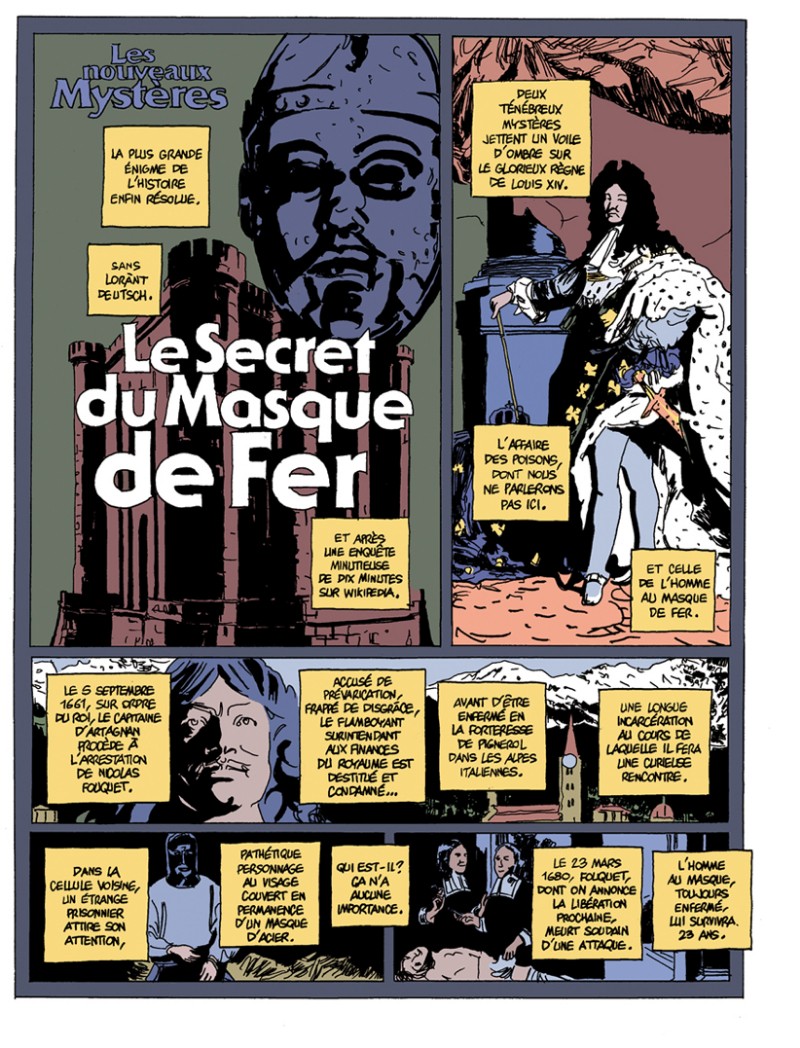 ans Les Nouveaux Mystères, Jake Raynal (Francis, Cambrioleurs) continue sa croisade pour faire la lumière sur les grandes énigmes et les fausses vérités de notre époque. Partageant le même désir de dénoncer et d'expliquer que Darryl Cunningham dans ses Fables scientifiques, mais sur un mode plus déconnant (on ne sort pas de Fluide Glacial indemne), ces chroniques oscillent entre absurde pur (Le garçon sur qui il pleut) et le véritable exposé philosophique ou technologique (La théorie de la justice, La croisière quantique). Les notions évoquées sont parfois ardues mais, c'est heureux, astucieusement décortiquées, immanquablement captivantes et, évidemment, toujours très drôles. Plus que tout, ces historiettes démontrent toute la curiosité et l'immense culture de l'auteur. Ce dernier, n'a-t-il pas réussi à élucider le secret du Masque de Fer après une enquête minutieuse de seulement dix minutes sur Wikipédia ?