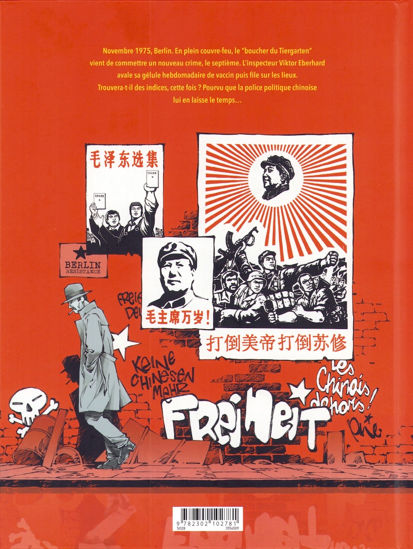 La couverture nous montre la ville de Berlin mais avec un titre et une couverture de rouge pourpre qui rappelle la Chine de Mao. En fait, la capitale allemande est occupée en 1975 par les chinois tout comme la majorité de l’Europe après que ces derniers ont répandu un virus destructeur à travers le monde qui a fait des millions de mort. Cela ne vous rappelle rien ? En fait, ces événements ont eu lieu peu après la Seconde Guerre Mondiale alors que l’Europe tentait de se reconstruire sans l’aide des Etats-Unis menant une politique isolationniste. On aurait pu penser que la Russie de Staline allait envahir l’Europe mais cette uchronie emprunte une toute autre direction pour nous dire que le véritable péril était jaune. Il fallait y penser. Une fois qu’on a accepté le principe, on va suivre un vieil inspecteur incorruptible dans une enquête pour des meurtres en série dans les parcs de la ville. On lui colle un jeunot dans les pattes. Ils vont former un tandem. Rien de plus classique que le duo mal assorti d’autant que l’inspecteur est veuf et que même sa fille unique l’a quitté voilà plusieurs années. Il faut dire qu’il s’est plongé dans son travail mais également dans l’alcool. Le dessin est en noir et blanc ce qui peut surprendre au premier abord car la couverture et le format laissaient présager de la couleur. C’est assez inhabituel mais on s’y fait. Il faut dire que l’ambiance voulu par l’auteur est celui d’un polar noir dans la plus pure tradition. Le trait demeure net et précis tout en restant dans un style réaliste ce qui est pour moi un modèle de lisibilité. Et c’est là où le bât blesse un peu car nous avons un mélange d’uchronie politique avec une enquête criminelle classique. Il y a aura forcément un mélange de genre qui donne quelque chose d’assez original et sans doute trop pour être crédible. On ressort quand même un peu décontenancé d’un tel récit. Pour autant, l’auteur Clarke a pris son temps pour nous présenter une intrigue policière avec un personnage qui a de l’épaisseur. A noter également un effort dans le découpage du scénario pour donner du rythme à l’ensemble. La moralité de cette BD est que nul ne peut échapper à la politique même si on souhaite la fuir. Après tout, on vit dans un pays et sous un régime plus ou moins autoritaire. A un moment donné, les enjeux politiques nous rattrapent et il faut payer la note. A-t-on envie de vivre dans cette Chine nouvelle ? Certainement pas.BDGest 2014 - Tous droits réservés