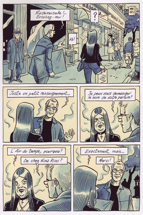 Difficile d'aborder un tel sujet dans un media censé faire la part belle au visuel. Comment, en effet, montrer graphiquement des senteurs ou des arômes particuliers ? Tout d'abord, l'auteur a choisi un traitement proche de la bichromie avec des couleurs jouant principalement sur des tons bleus-gris. Le rendu peut paraître un peu fade mais permet de se concentrer sur l'essentiel : les volutes de fumée ou autres émanations diverses, omniprésentes au quotidien. L'album commence par un épisode qui repose sur une anecdote mais qui donne l'occasion au lecteur de pénétrer en douceur dans un environnement familier. Qui n'a jamais, en effet, respiré un parfum dont la fragrance de fleurs ou de vanille a rappelé quelques anciennes conquêtes ?