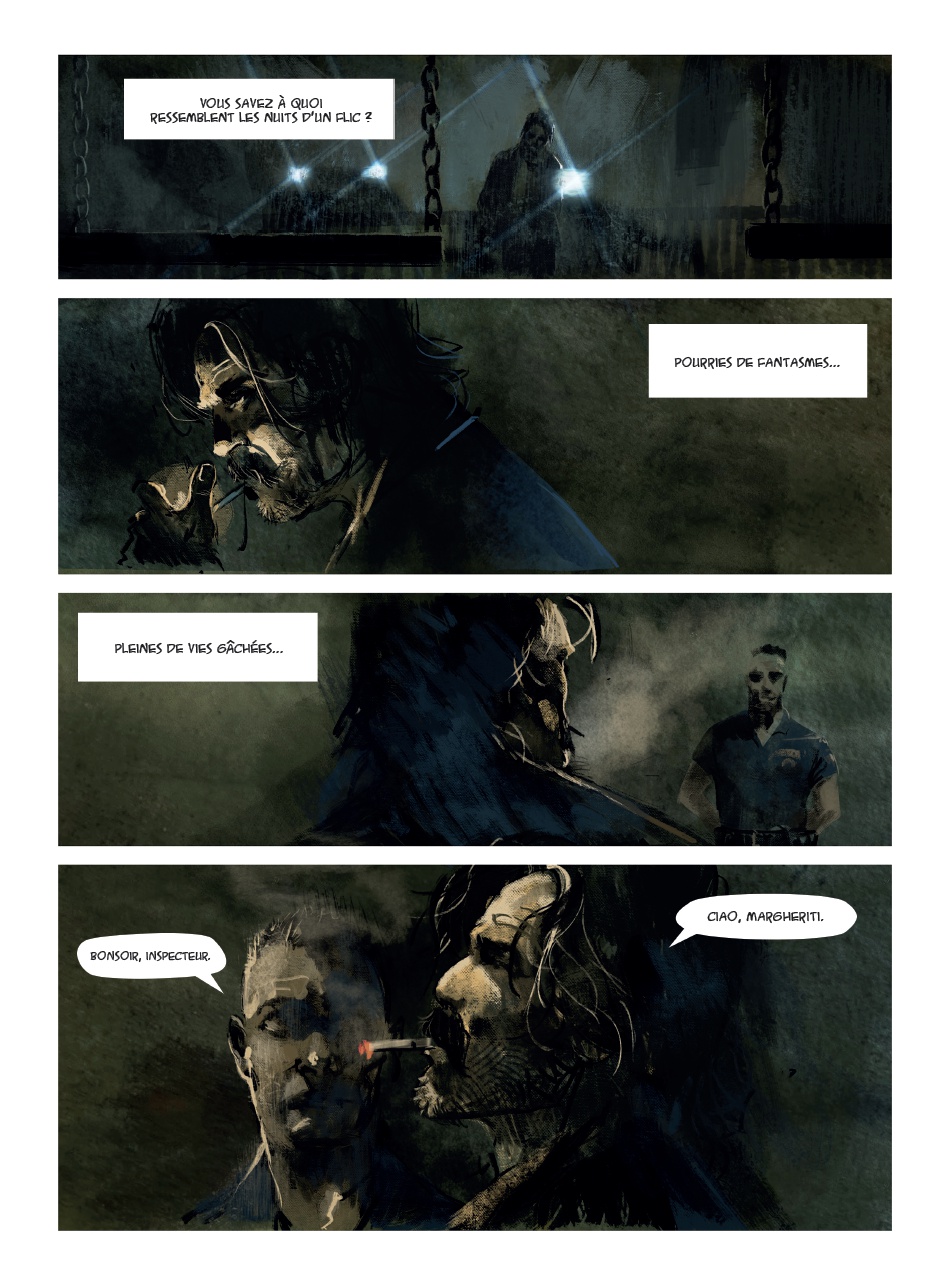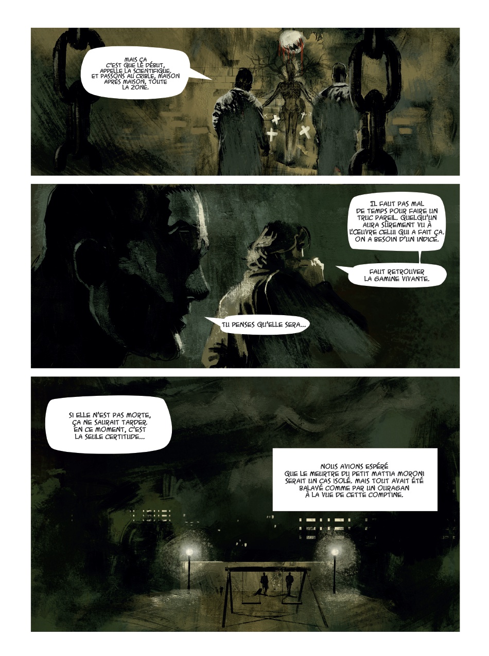 Les nuits romaines sont assez réputées. Jim pourrait en dire quelque chose (voir sa magnifique série complète). Pourtant, elles ne sont pas toujours aussi bénéfiques surtout quand des meurtres d'enfants se produisent ce qui est l'objet de cette BD polar. Cela introduit notre principal personnage Flavio, enquêteur de métier mais assez désabusé par la vie, qui va mener ses investigations jusqu'au bout pour retrouver le meurtrier. Oui, nous avons droit en l’occurrence à un polar italien avec tous les codes du genre. On notera surtout un graphisme assez pictural qui donne dans l'art. J'ai regretté surtout une colorisation assez sombre et dépressive sur l'ensemble de l'album. Cela manque singulièrement de clarté. Par contre, on peut dire que ce dessin est tout à fait adapté à ce genre de récit assez torturé qui mène le lecteur sur des pistes difficiles au point de ne pas en deviner la conclusion. Je peux dire que j'ai été plutôt bluffé par ce polar sans prétention et avec ce style de graphisme assez gothique. C'est plutôt ce que j’appellerai une bonne surprise. Bref, la collection Mosquito a encore frappé fort avec ce titre d'auteurs qui n'ont jamais encore publié en France. C'est manifestement à découvrir mais pas à mettre en toutes les mains.Le 16/06/2025 à 15:41:15