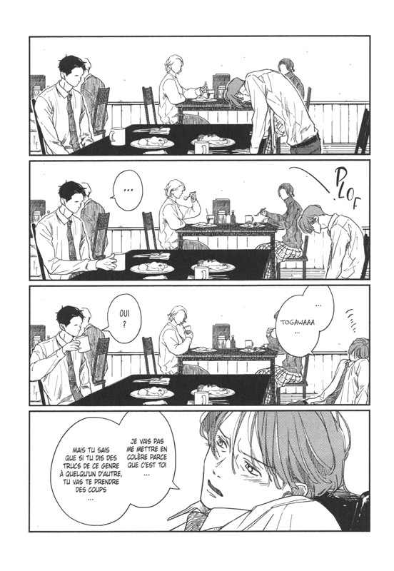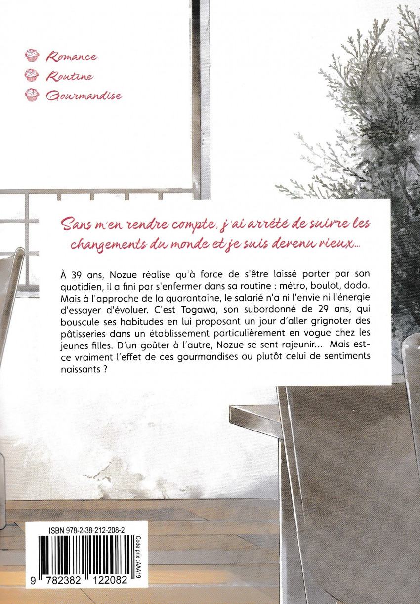Résumé: À 39 ans, Nozue réalise qu'à force de s'être laissé porter par son quotidien, il a fini par s'enfermer dans sa routine : métro, boulot, dodo. Mais à l'approche de la quarantaine, le salarié n'a ni l'envie ni l'énergie d'essayer d'évoluer. C'est Togawa, son subordonné de 29 ans, qui bouscule ses habitudes en lui proposant un jour d'aller grignoter des pâtisseries dans un établissement particulièrement en vogue chez les jeunes filles. D'un goûter à l'autre, Nozue se sent rajeunir... Mais estce vraiment l'effet de ces gourmandises ou plutôt celui de sentiments naissants ?