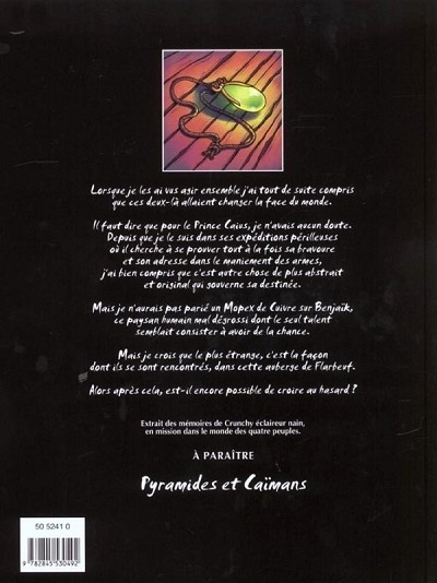 Résumé: Lorsque je les ai vus agir ensemble j'ai tout de suite compris que ces deux-là allaient changer la face du monde. Il faut dire que pour le prince Caius, je n'avais aucun doute. Depuis que je le suis dans ses expéditions périlleuses où il cherche à se prouver tout à la fois sa bravoure et son adresse dans le maniement des armes, j'ai bien compris que c'est autre chose de plus abstrait et original qui gouverne sa destinée. Mais je n'aurais pas parié un Mopex de cuivre sur Benjaïk, ce paysan humain mal dégrossi dont le seul talent semblait consister à avoir de la chance. Mais je crois que le plus étrange, c'est la façon dont ils se sont rencontrés, dans cette auberge de Flarbeuf. Alors après cela, est-il encore possible de croire au hasard ? (extrait des mémoires de Crunchy éclaireur nain, en mission dans le monde des quatre peuples.)