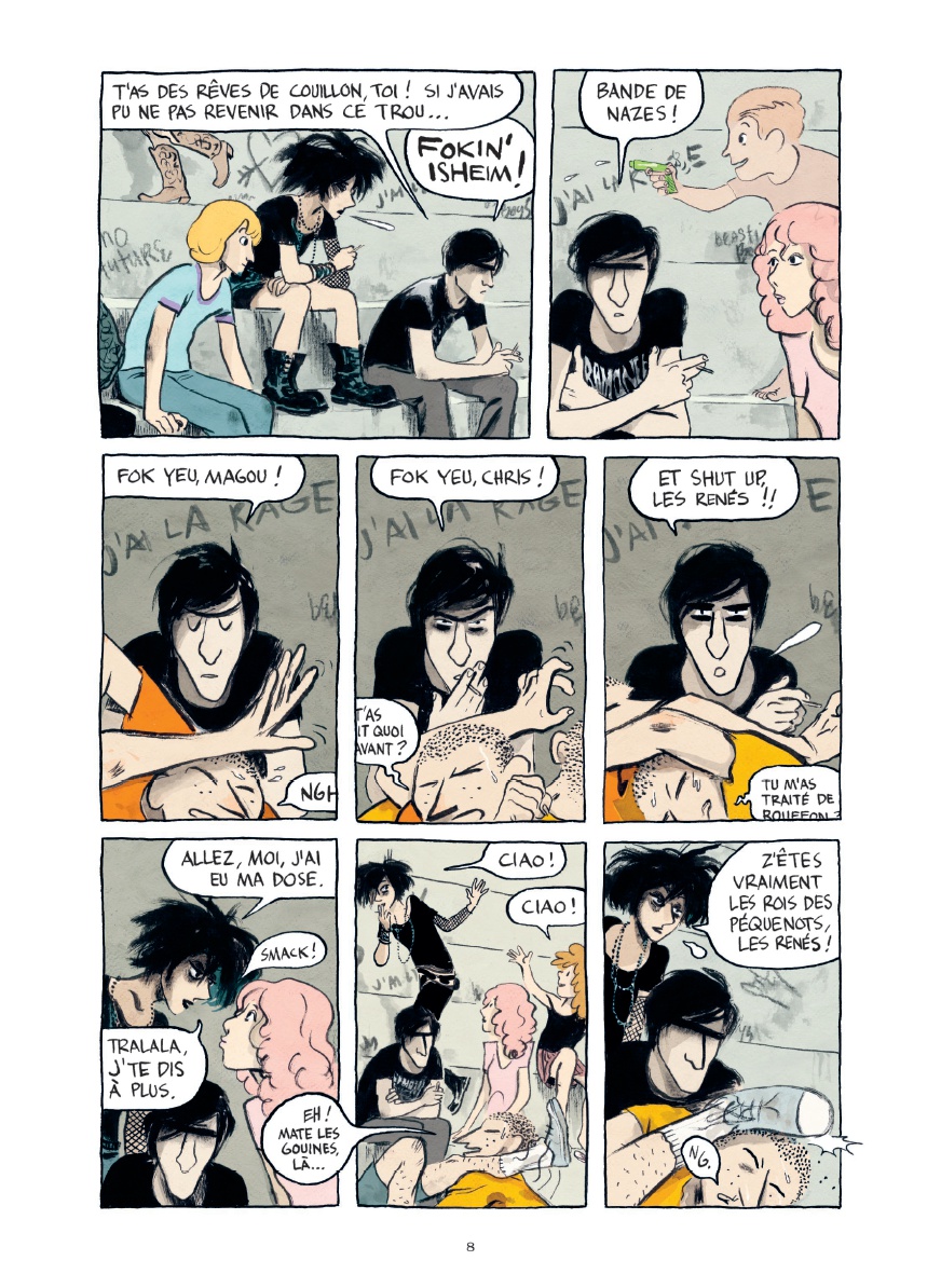 Résumé: Années 1990. Un groupe de jeunes désoeuvrés traîne son ennui dans une petite ville pavillonnaire du Grand Est. Isheim est peut-être un endroit où les parents trouvent leur compte de tranquillité après le travail mais, à seize ans, la tranquillité ne fait pas partie des rêves que l'on peut avoir. Certains, comme Chris, Magou ou Tralala, font avec... aussi parce qu'il faut bien quelqu'un pour s'occuper des petits frères et soeurs. Mais Hervé et Vivi, eux, ne pensent qu'à partir. Où ? « N'importe où ! Loin de ce trou. » En attendant, ça débat sur la bonne prononciation de fuck, ça organise des boums à coup de Goldman et Jeanne Mas - une vraie « fanfare de punks » pour les voisins -, ça se retrouve la nuit en cachette...