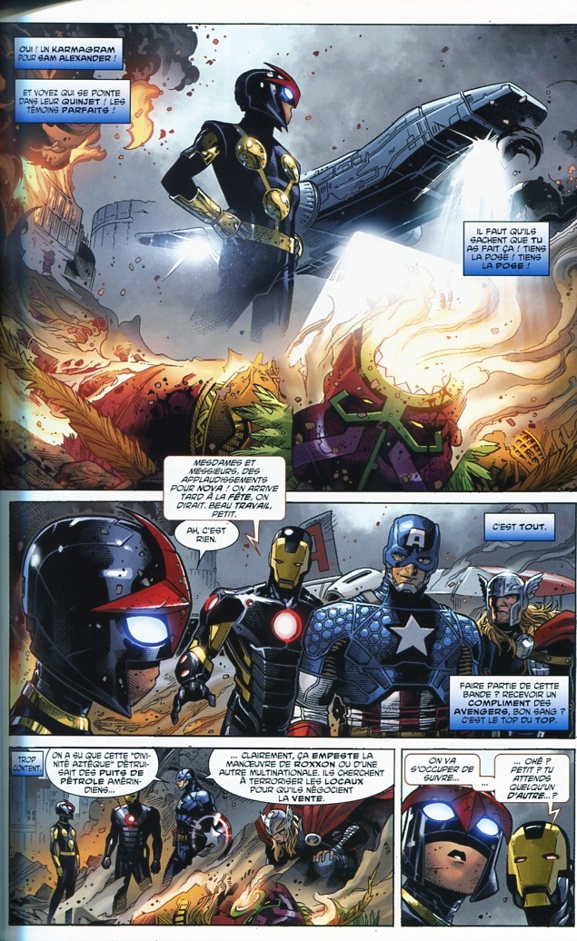 Malgré la présence au casting de nombreux super-héros et une histoire qui tourne autour d’une entité cosmique, le scénario de Jason Aaron parvient à rester à taille humaine et n’abuse pas des scènes d’action. Débutant comme une enquête, l’histoire change cependant de direction à mi-parcours pour s’intéresser de près au rôle de Nick Fury et se terminer par le – classique mais rapide – affrontement final. Il s’agit finalement d’une histoire interne aux super-héros, on s’intéresse en effet assez peu à leurs adversaires (des adversaires de seconde zone à vrai dire) ou à leurs motivations.
