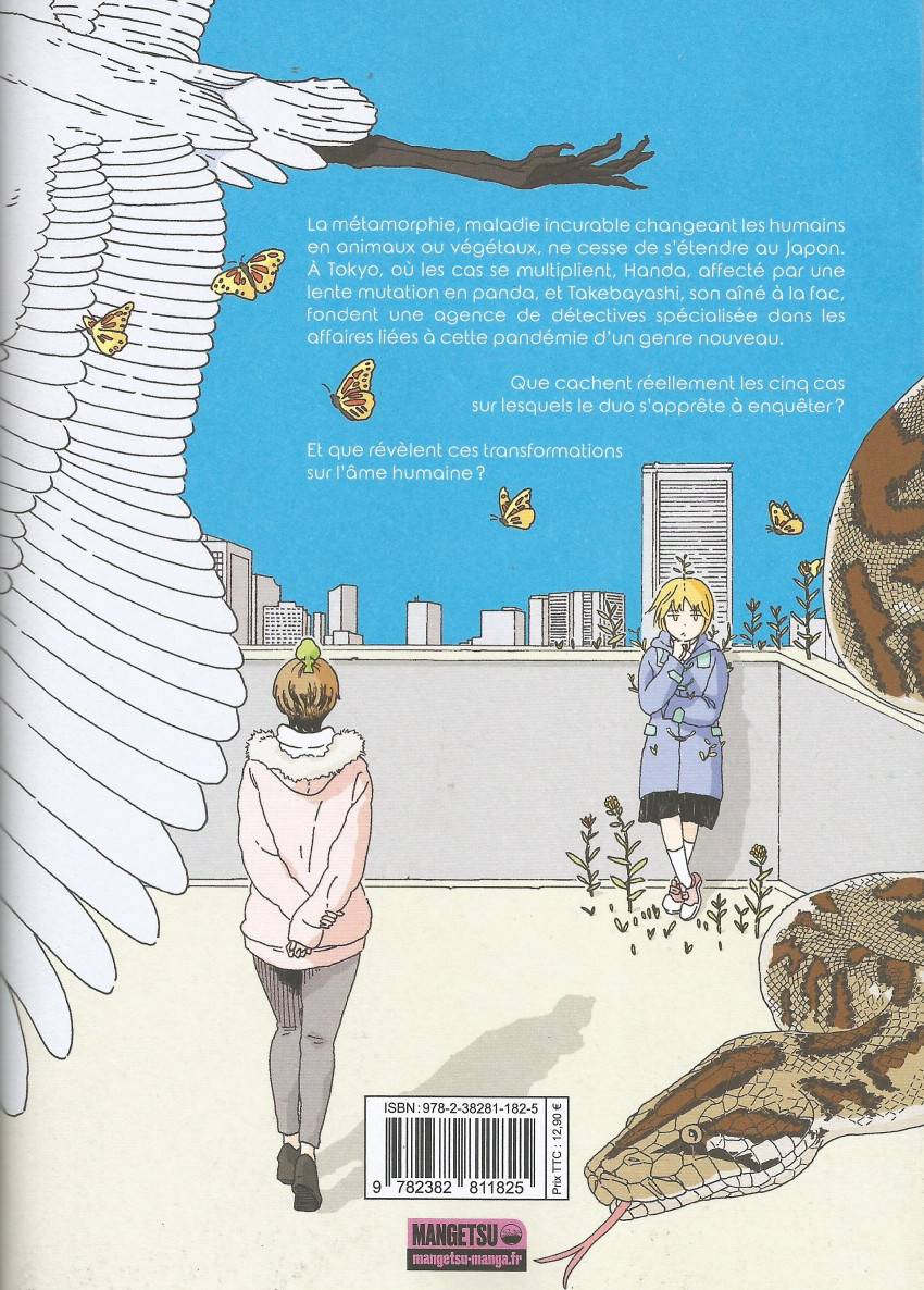 Que cachent réellement les cinq cas sur lesquels le duo s'apprête à enquêter ? Et que révèlent ces transformations sur l'âme humaine ?La métamorphie, maladie incurable changeant les humains en animaux ou végétaux, ne cesse de s'étendre au Japon et à Tokyo tout particulièrement. Handa, affecté par une lente mutation en panda, et Takebayashi, son aîné à la fac, fondent une agence de détectives spécialisée dans les affaires liées à cette pandémie d'un genre nouveau.