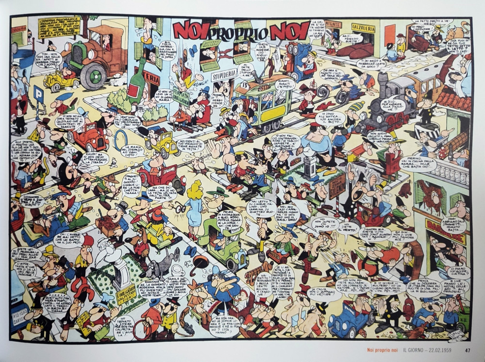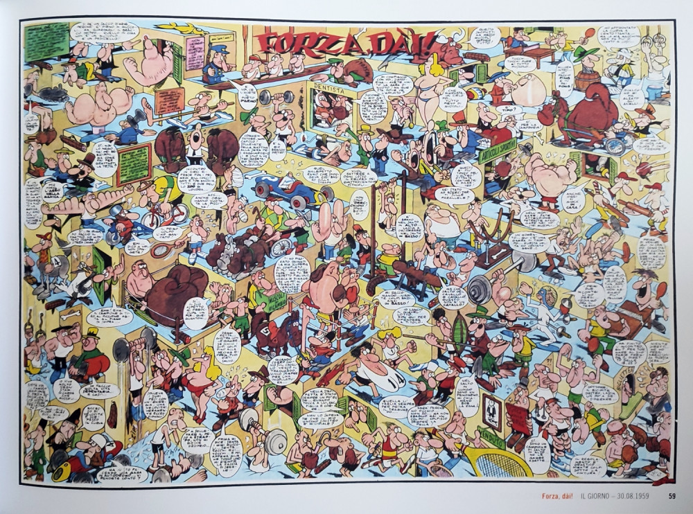 Résumé: Universalmente noto come autore di fumetti per ragazzi, Benito Jacovitti sperimentò molte altre forme di umorismo grafico. In particolare diede vita a "creature" anomale, le Panoramiche, composizioni vignettistiche estese su un'intera o una doppia pagina: formalmente un'unica immagine, abitata però da una folla brulicante di personaggi immersi in un'atmosfera di dialoghi surreali, azioni paradossali, movenze e presenze graficamente assurde. "Paginoni" rivolti a un pubblico adulto, capace di comprendere il groviglio di allusioni beffarde: alla società, alla politica, ai tic comportamentali e via discorrendo. Decine di migliaia di battute e vignette, un immenso materiale comico disperso in varie pubblicazioni, anche popolari, e mai finora raccolto in modo organico.