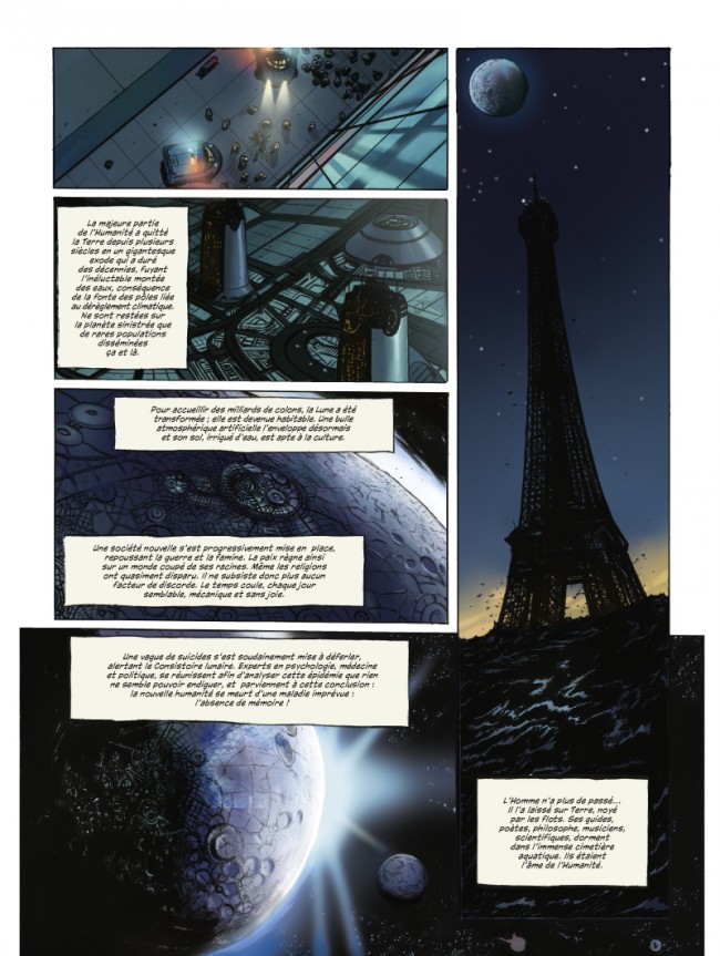 En effet, la Terre a été engloutie par la montée des eaux et les Humains ont fui, direction la Lune où règne la paix sur un monde coupé de ses racines. S'ensuivent une série de suicides inquiétants. Les membres du Concile gouvernant la Lune décident d'envoyer sur Terre un groupe de scientifliques mené par le professeur Olorme afin de ramener des traces du passé sur Terre car une société ne peut pas se bâtir hors du terreau du passé.