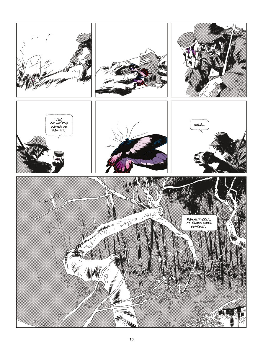 Fable écolo sur fond de surexploitation de la forêt amazonienne : les très belles planches de l'album nous emmènent à la chasse aux papillons. Matz est un auteur que l'on connaît bien et que l'on apprécie beaucoup (la série Le Tueur, c'est lui), mais on ne le connaissait pas collectionneur de papillons ! Entre deux polars, il s'est autorisé une petite parenthèse écolo avec Frédéric Bézian pour nous emmener à la chasse aux papillons en Amazonie : Les papillons ne meurent pas de vieillesse. Matz s'est même permis un petit clin d’œil à ses fans puisqu'il a baptisé son papillon impossible le Parides Ascanius Nolentus (son nom de ville est Alexis Nolent) ! Au fil de leur courte existence de quelques jours "les papillons, fragiles et vulnérables, ne meurent pas de vieillesse, mais de mort violente". ? Voilà bien une sympathique fable écolo sur fond de surexploitation de la forêt amazonienne : un roman d'aventures, un thriller politique qui met en scène les enjeux complexes de la région. ? Le dessin de Frédéric Bézian est une réussite avec un beau dégradé de gris que viennent illuminer de temps à autre seulement les parures colorées des papillons : un pari audacieux mais vraiment gagné. Le gris pointillé évoque les gravures scientifiques d'antan. Pour profiter des changements de rythme qu'autorise la BD (F. Bézian aime à dire qu'il ne fait pas du cinéma sur papier), l'album est émaillé de planches d'entomologie 'vintage' et même de quelques beaux haïkus comme celui-ci du poète japonais Arakida Mortake : « [...] Tombé de la branche Une fleur y est retournée : C'était un papillon. » ? L'album semble appeler une suite, d'autant qu'une douce complicité va se nouer entre la jeune Géraldine et le brésilien Candido ... ! On attend déjà avec impatience ! La réapparition d'espèces disparues de papillons n'est pas de la science-fiction. Il y a bien sûr quelques "lâchers" volontaires pour réintroduire certains insectes mais les entomologistes découvrent également des Résurrections tout à fait naturelles comme par exemple celle de la Nonagrie soulignée dans nos marais atlantiques. Cela vient compenser un petit peu les trop nombreuses extinctions. Camille est un expert entomologiste et grand collectionneur de papillons. Il emploie au Brésil un chasseur local, Candido. Chez lui en France, il héberge sa jeune cousine, Géraldine qui l'aide à trier ses bestioles. Camille et Géraldine vont rejoindre Candido en Amazonie. Cette histoire aurait pu s'intituler l'histoire du "chasseur de papillons qui n'existent pas" ... puisque l'intrigue se noue en Amazonie lorsque l'on capture par hasard un papillon censé avoir disparu depuis de nombreuses années. « [...] - Quel est le problème ? - Le problème c'est que ce papillon est un Parides Ascanius Nolentus. Le problème c'est qu'il vivait dans les marais de Rio de Janeiro ... ! ... et si je dis "vivait", c'est qu'il a disparu depuis des années ... ! Regarde Candido, mon chasseur, travaille dans l'état du Roraima, au nord du Brésil, à des centaines, voire des milliers de kilomètres de Rio de Janeiro ! Tu comprends le problème, maintenant ? » Un doux rêveur (Camille) et sa jeune cousine (Géraldine) vont accompagner le chasseur de papillons (Candido) au cœur de la forêt vierge pour confirmer la découverte énigmatique. Jusque là tout va bien pour cette petite équipe qui joue les Tintin en Amazonie, mais on se doute qu'avec Matz au scénario, la balade des gentils écolos ne sera pas de tout repos. Ainsi Camille rédige un article pour le National Geographic et appelle à sanctuariser le secteur pour le protéger de la déforestation : évidemment les sociétés multinationales ne voient pas d'un très bon œil les projecteurs de l'écologie soudainement braqués sur une région où ils prospéraient jusqu'ici à l'abri des regards et nos héros devront également faire face à l'hostilité des paysans locaux qui exploitent ces terres pour l'orpaillage et le pâturage. Au détour d'une belle planche d'entomologiste (page 25), l'album nous apprendra que le mot papillon vient du grec psukhê qui signifie souffle, le souffle de la vie qui caresse ce qu'il touche et par extension âme puisque celle-ci s'envole dans notre dernier soupir.BDGest 2014 - Tous droits réservés