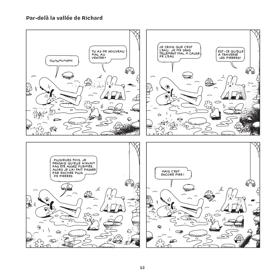 Sur près de 480 pages, Michael DeForge décrit une étrange odyssée à hauteur d'animaux, et par là même dynamite la bande dessinée animalière. Construit partiellement comme une enquête autour du mystérieux Richard, Par-delà la vallée de Richard décortique et met en lumière, non sans humour, les mécanismes sectaires qui mènent à la manipulation mentale, à l'asservissement et à la perte de liberté. Mais DeForge ne s'arrête pas là, et en confrontant les animaux à la ville, il dresse le portrait des grands centres urbains d'aujourd'hui (et plus particulièrement de Toronto, la ville dans laquelle il vit toujours aujourd'hui) : disparition des commerces de proximité et des lieux culturels, transformation et déshumanisation des quartiers, gentrification galopante, etc.