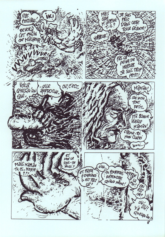 Tel un petit lecteur se jetant sur ses feutres après avoir fini son illustré, il improvise une intrigue qui se perd et revient au gré des envies. Le dessin est intuitif, les expériences de toutes sortes et les références à la culture populaire pleuvent, nous démontrant qu'on peut être encore un petit peu intéressant après 8 ans.