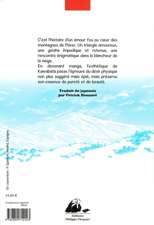 Yasunari Kawabata est considéré comme l'un des plus grands écrivains nippons du vingtième siècle et Pays de neige, écrite dans les années trente, comme une œuvre majeure. Trois personnages principaux, une intrigue banale et pourtant... Itsugi Sakuko, habitué des récits romantiques, respecte rigoureusement le texte dans cette adaptation. Le choix est judicieux, car la beauté de la prose est l'atout indéniable avec la force des métaphores, le contraste entre le tumulte des sentiments et le silence de la neige qui devient un protagoniste à part entière. Il est question d'amour bien sûr, de passion, de doute. Il ne se passe pas grand-chose dans cette histoire, mais l'envoûtement est puissant. Le lecteur suit les subtiles interactions entre les héros, les revirements sentimentaux, les petits riens dont se nourrissent leurs rapports et tente de déchiffrer les non-dits (typiquement japonais !).